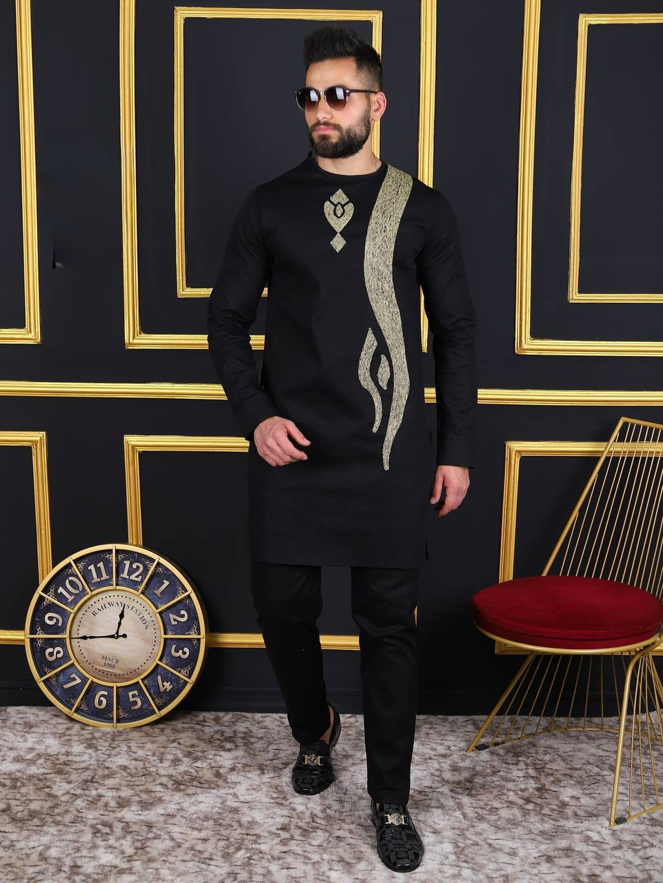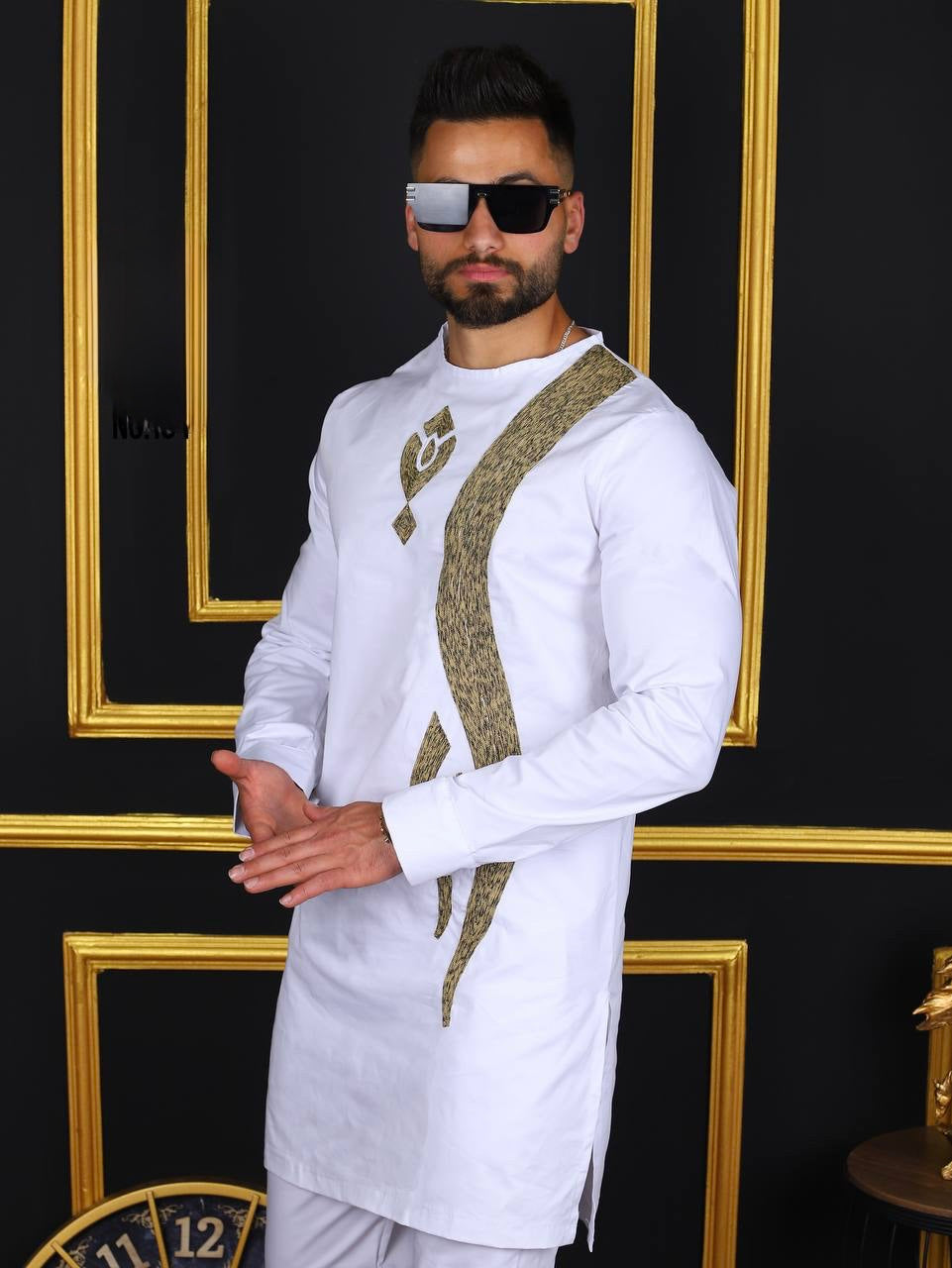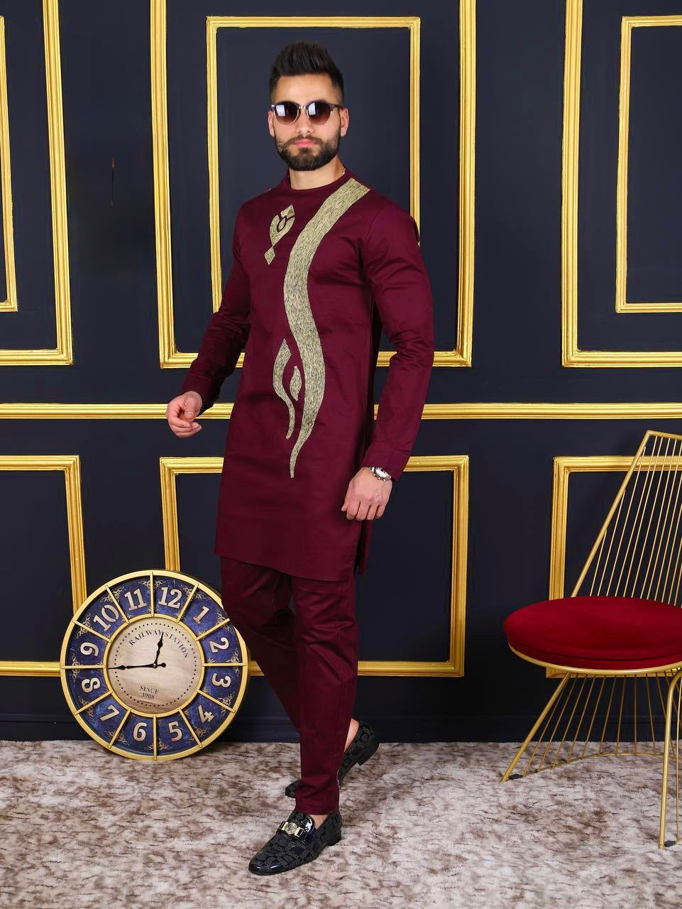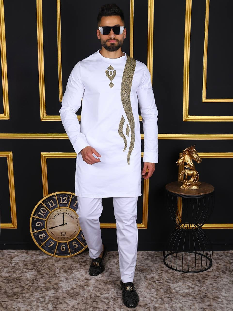Elegant African Men’s 2-Piece Set Embroidered Cotton Shirt & Pants – Luxury Look for Groomsmen Aso Ebi, Engagement Ceremony & Birthday Parties