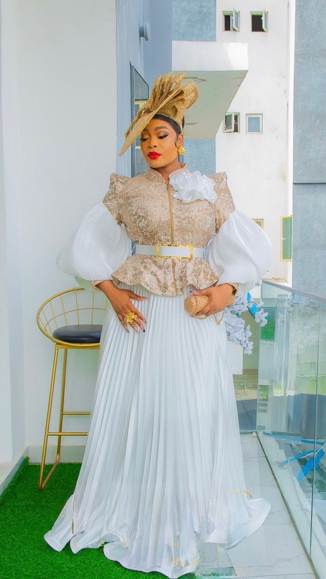 White and Gold Bishop Sleeve 3D Flower Peplum Top & Pleated Maxi Skirt 2-Piece Set
