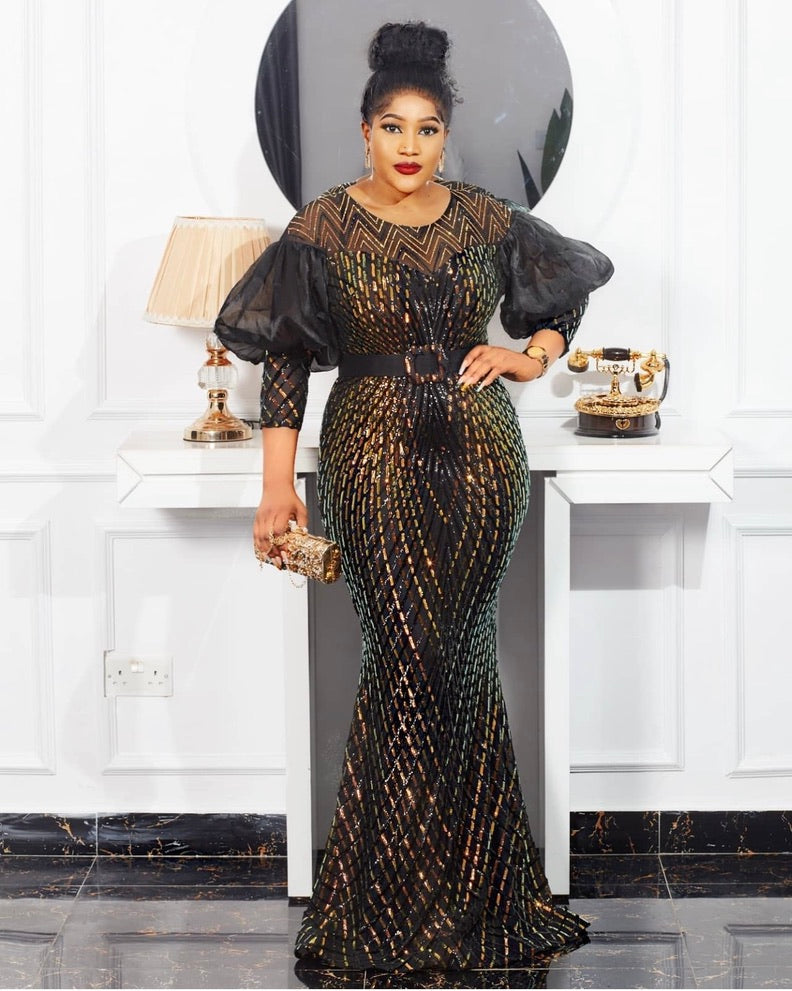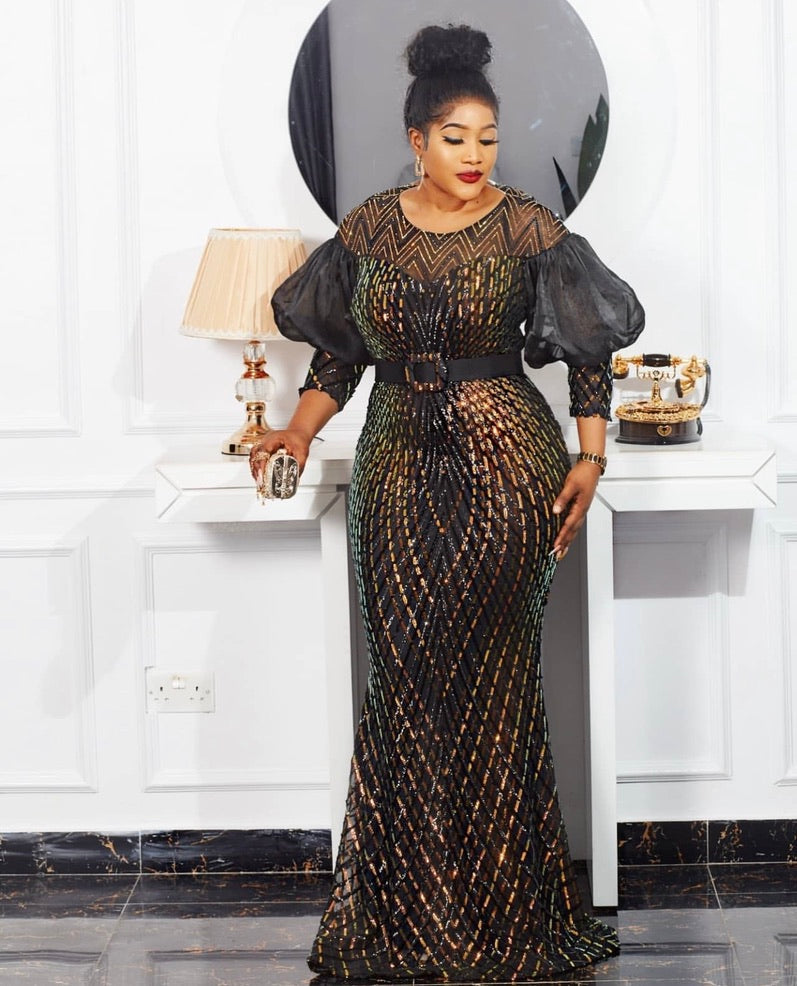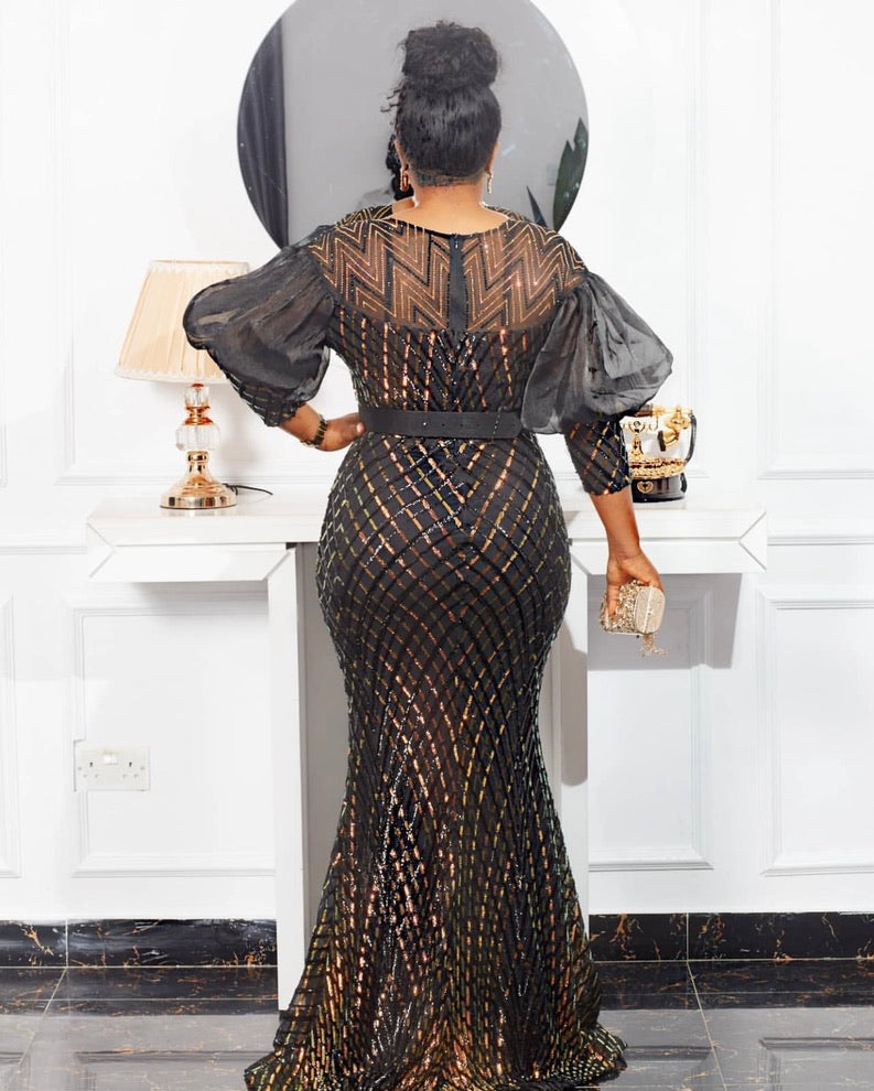 Black and Gold Sequin Maxi Dress Dramatic Sleeves