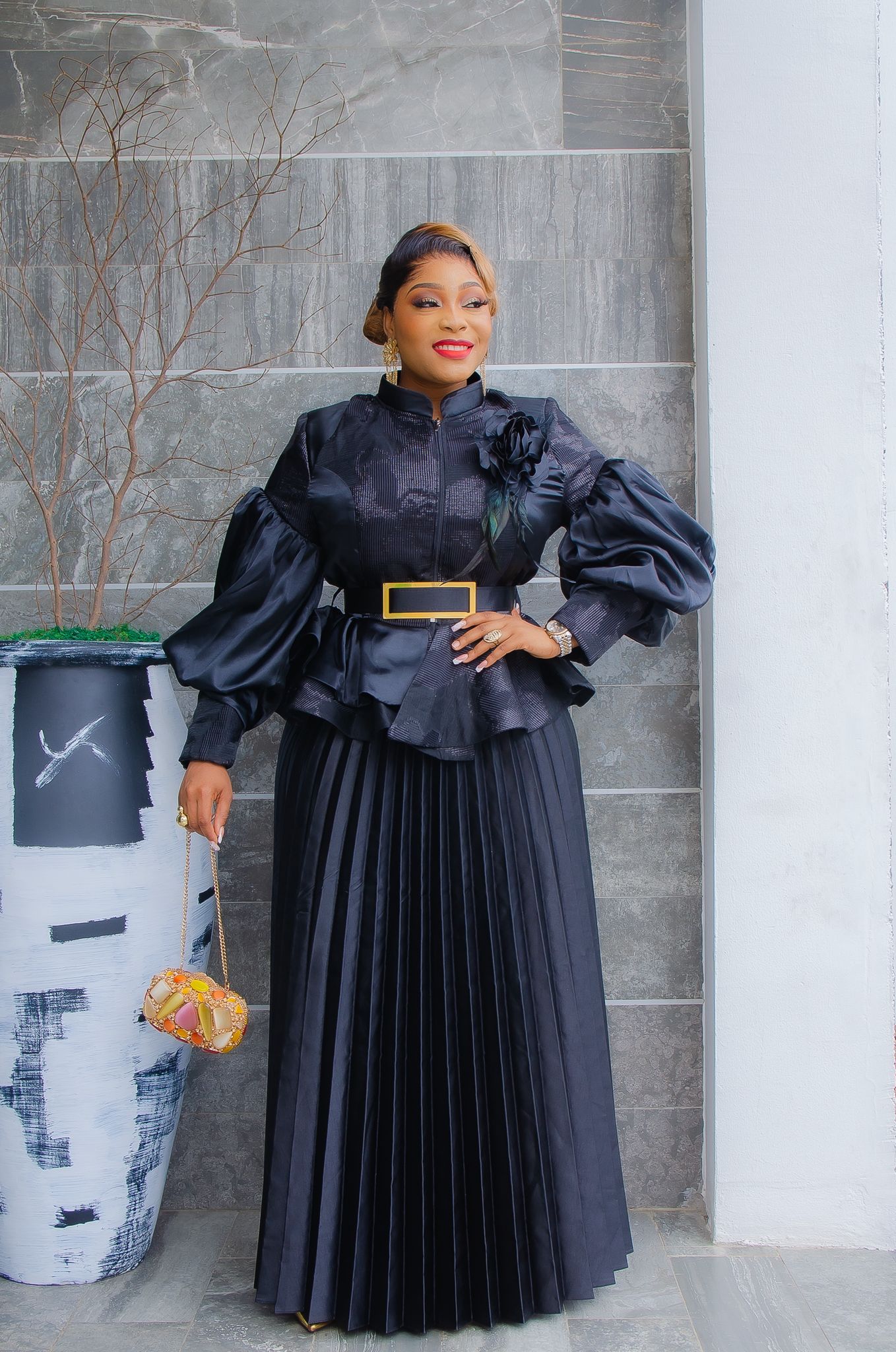Black Brocade Rosette Peplum Top and Pleated A-Line Skirt for Birthday Party Cocktail Dinner Wedding Photoshoot