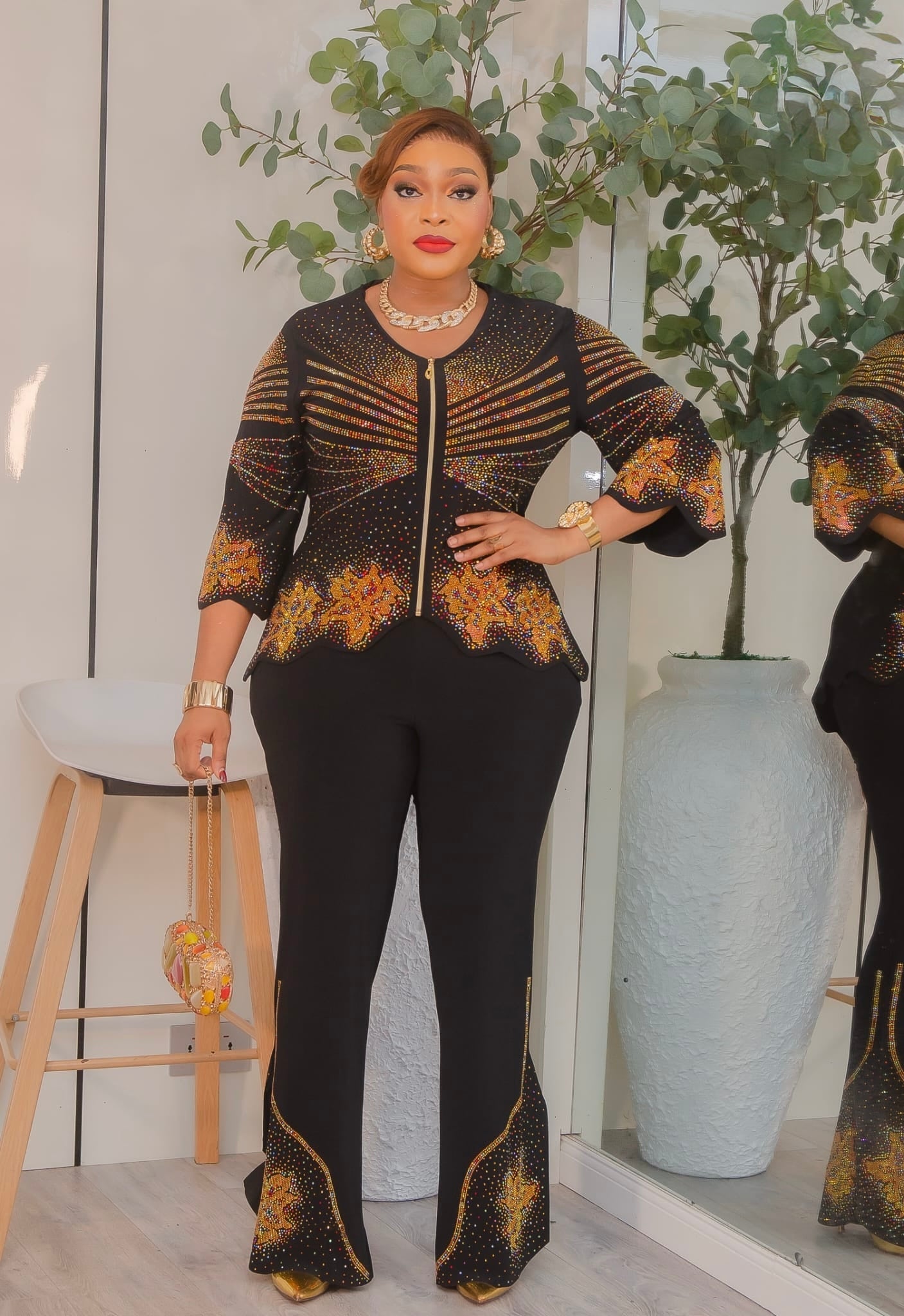 Black Rhinestone Embellished 2-Piece Set, Matching Curvy Top & Pants: Wedding Guest Outfit Graduation Cocktail