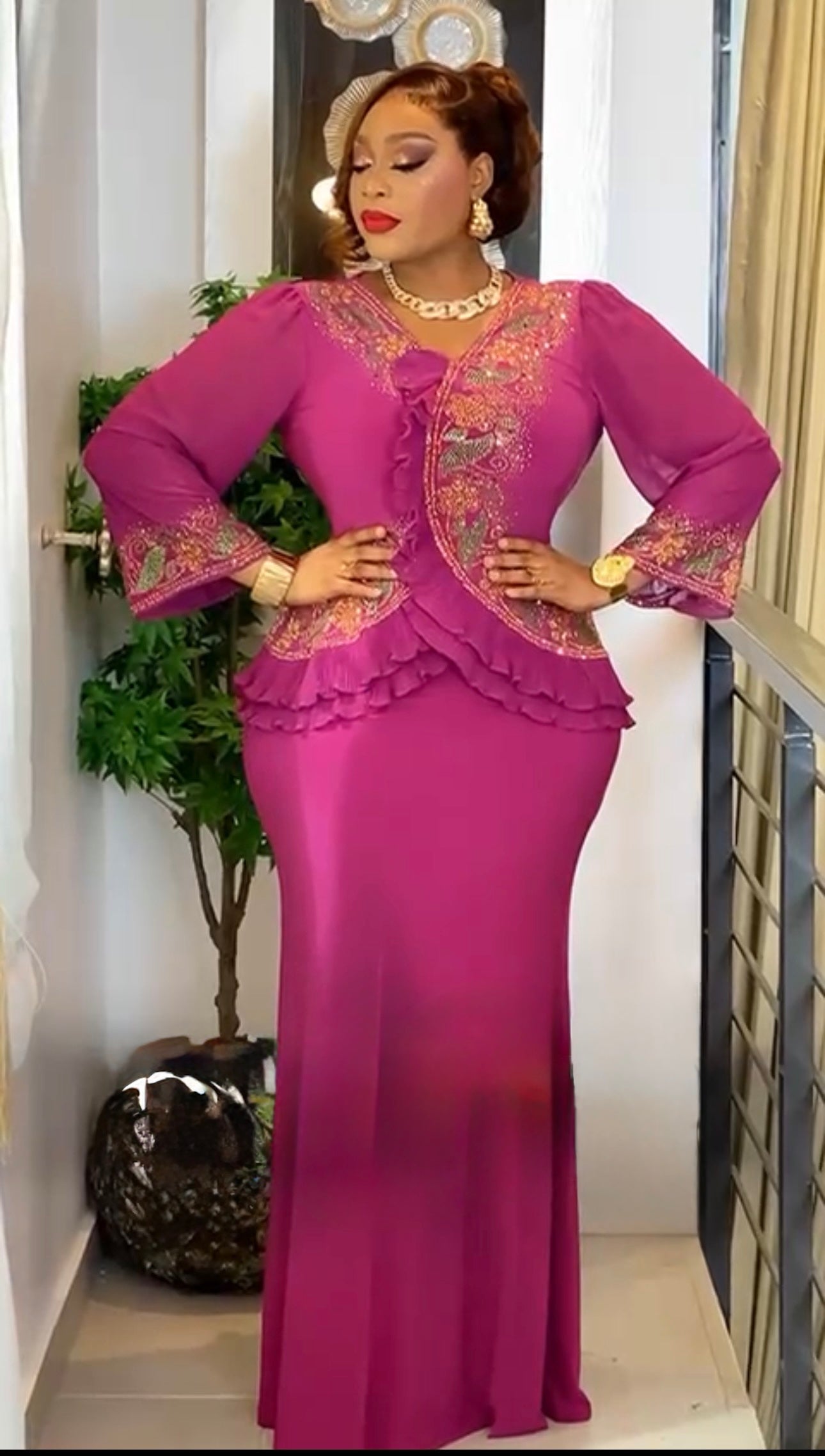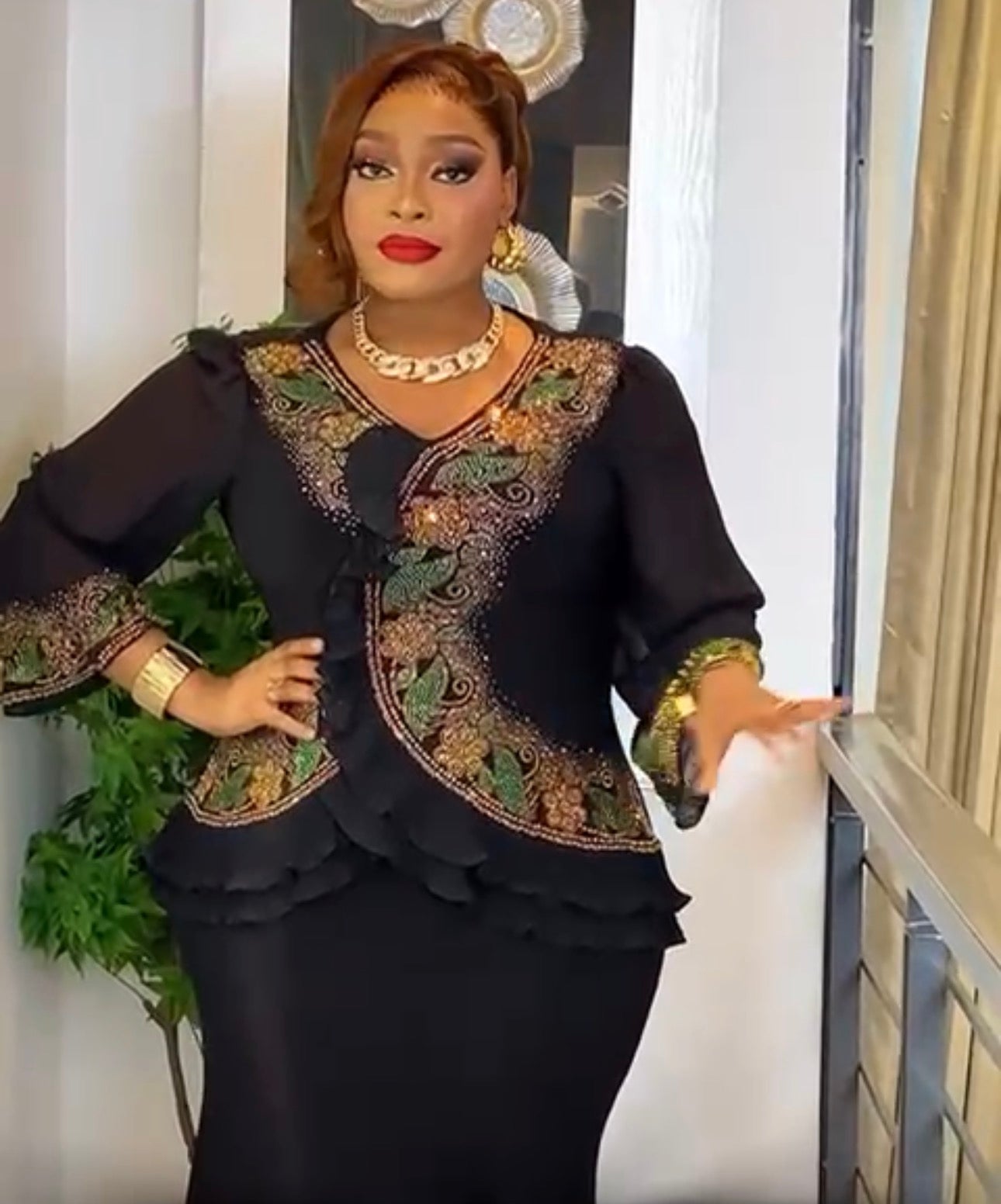 Black Rhinestone-Embellished Ruffle Peplum Maxi Dress: Wedding Guest Outfit