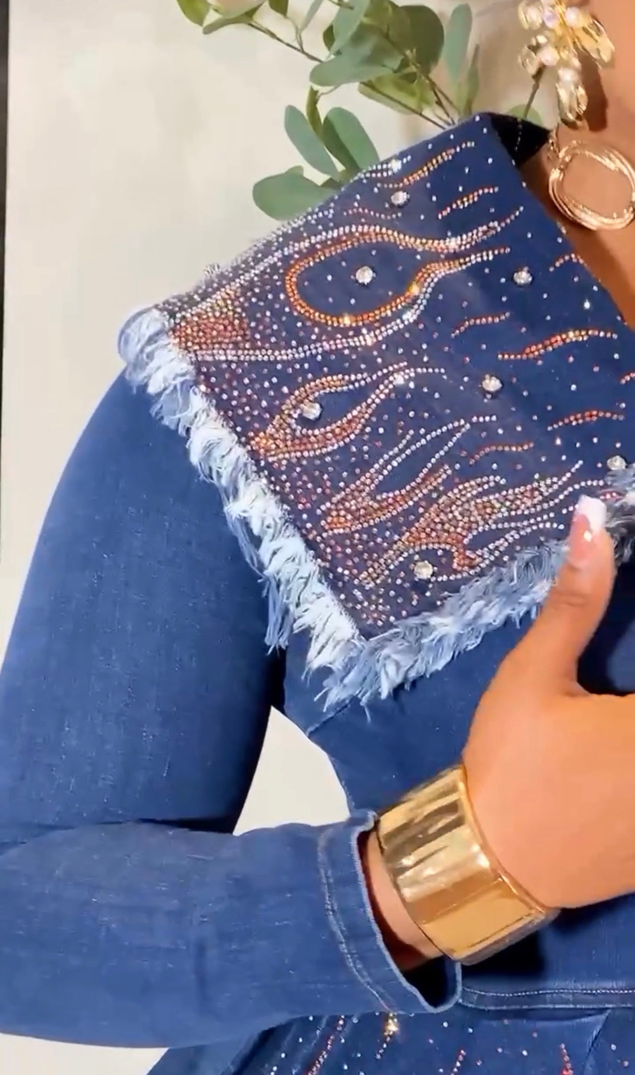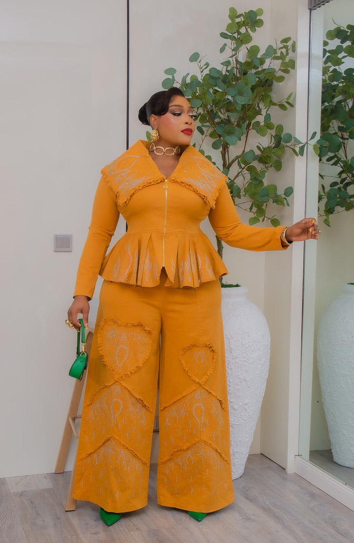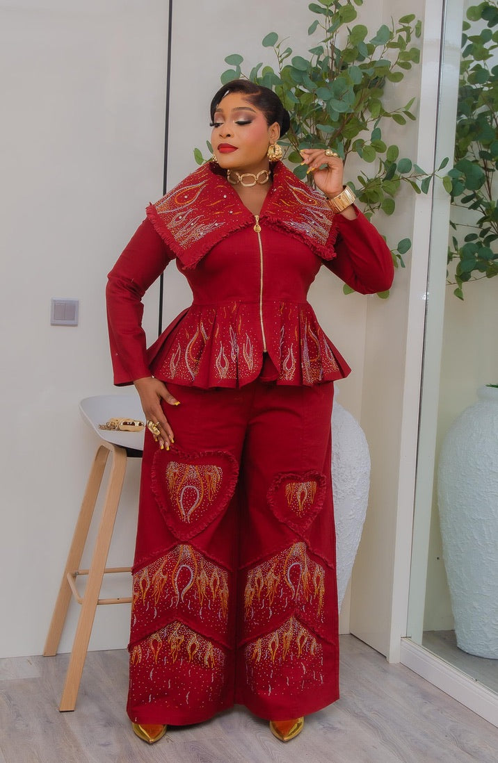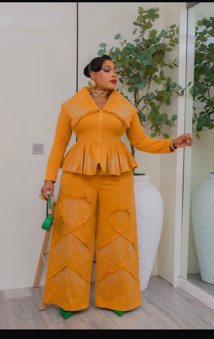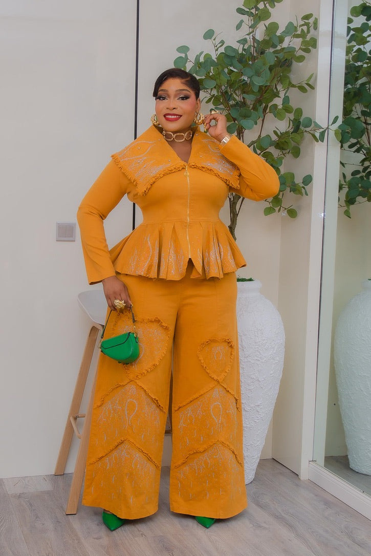Denim & Diamonds 2-Piece Set, Matching Rhinestone Peplum Top + Wide-Leg Pants, Glam Statement Birthday Outfit