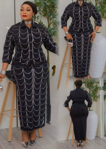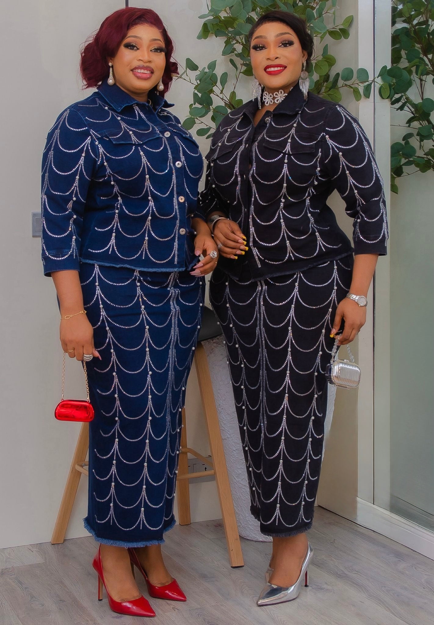 Denim & Diamonds 2-Piece Set, Birthday Party Outfit, Curvy Stretch Rhinestone Top & Skirt