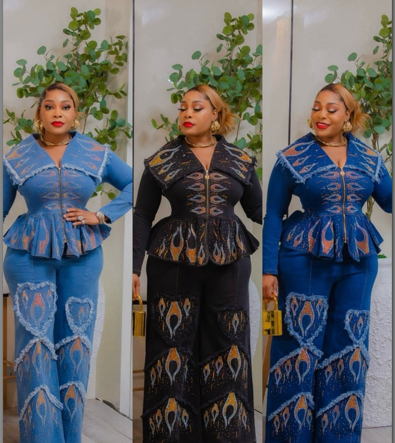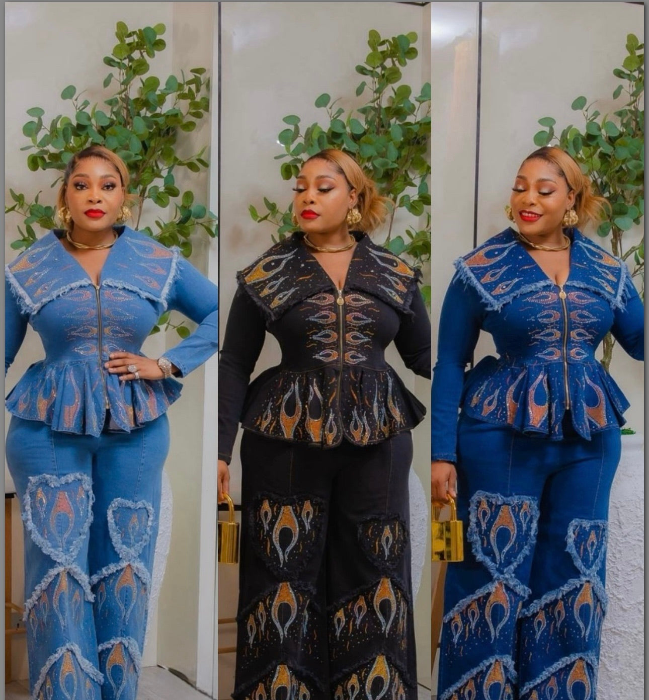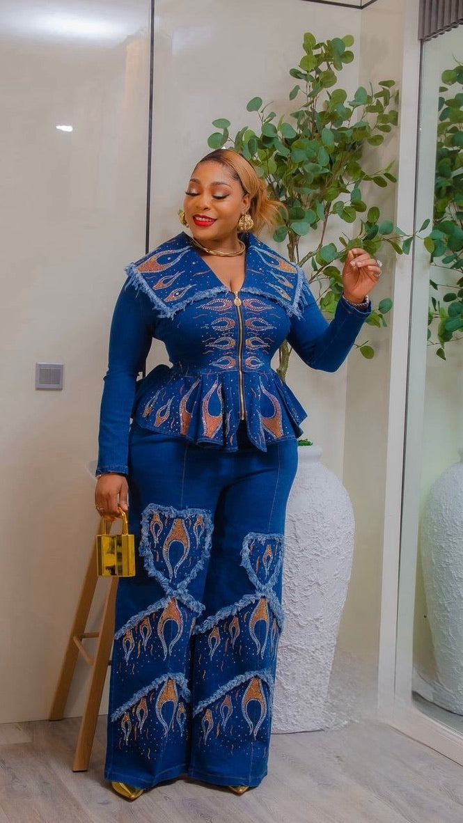 Denim on Denim 2-Piece Outfit Set Rhinestones Stretch Curvy Jeans