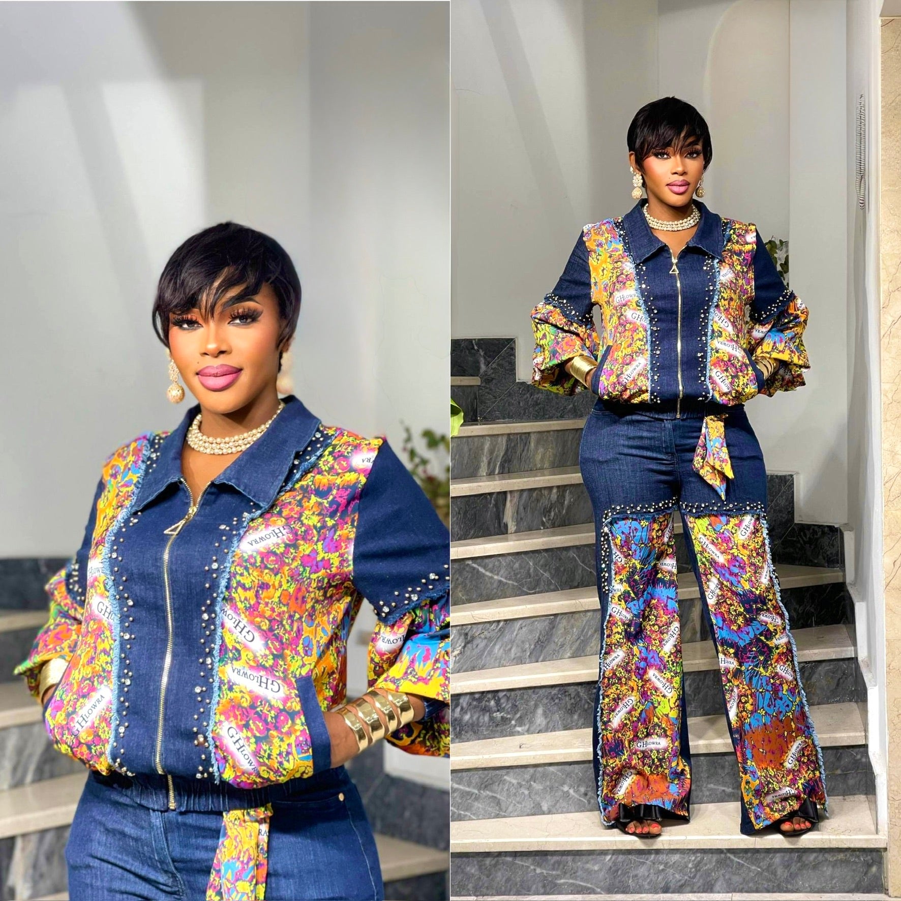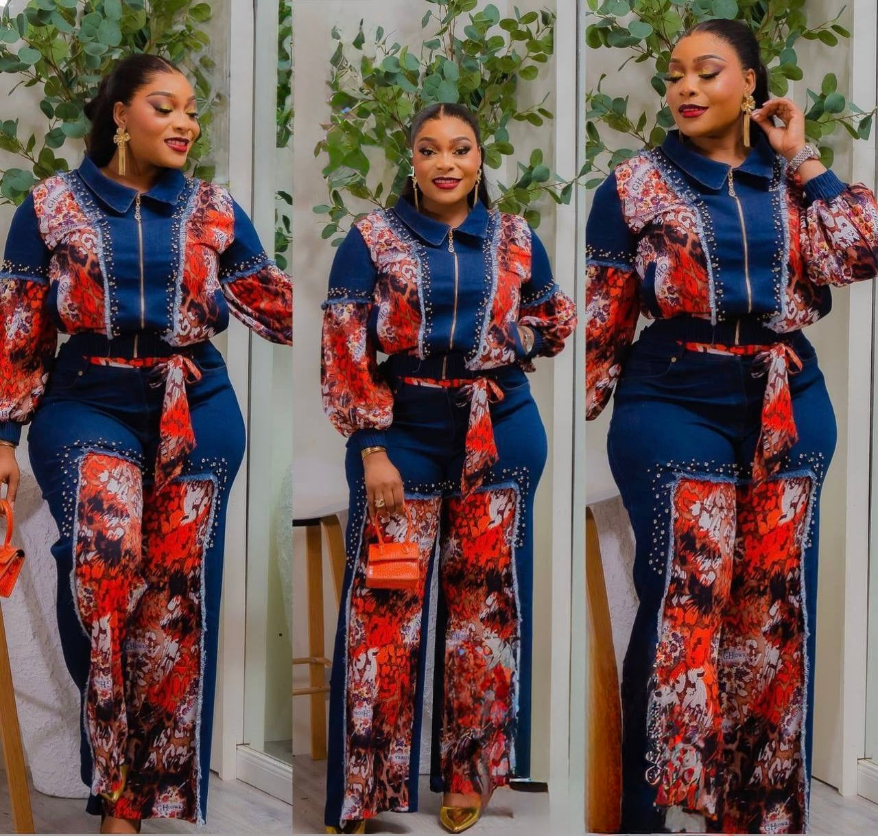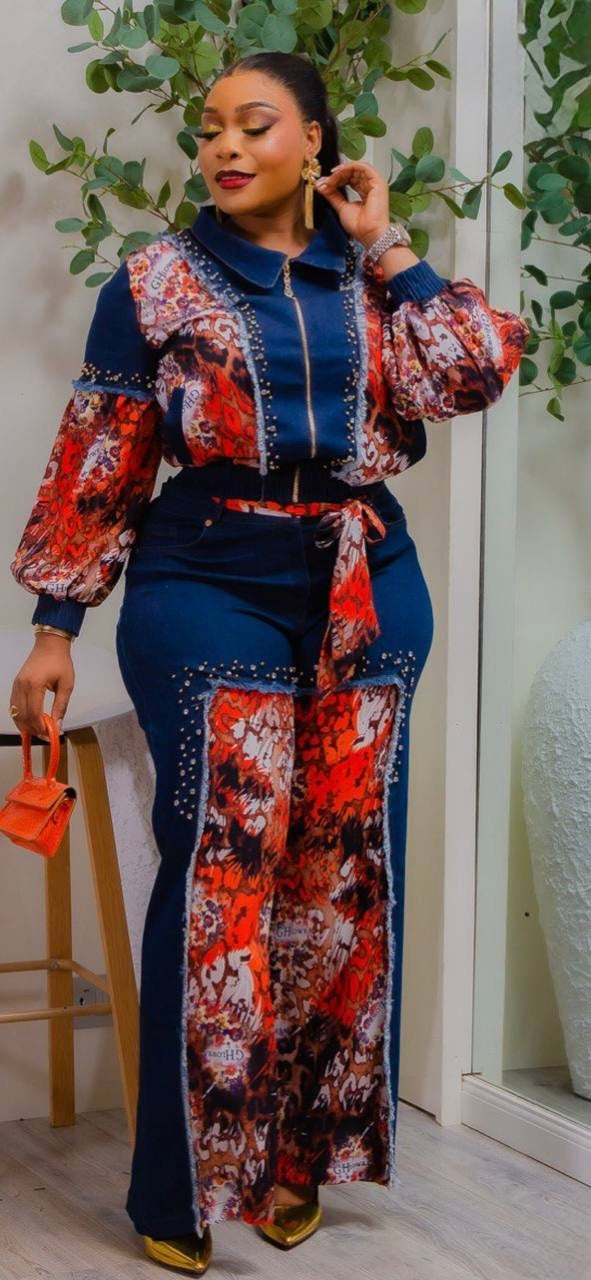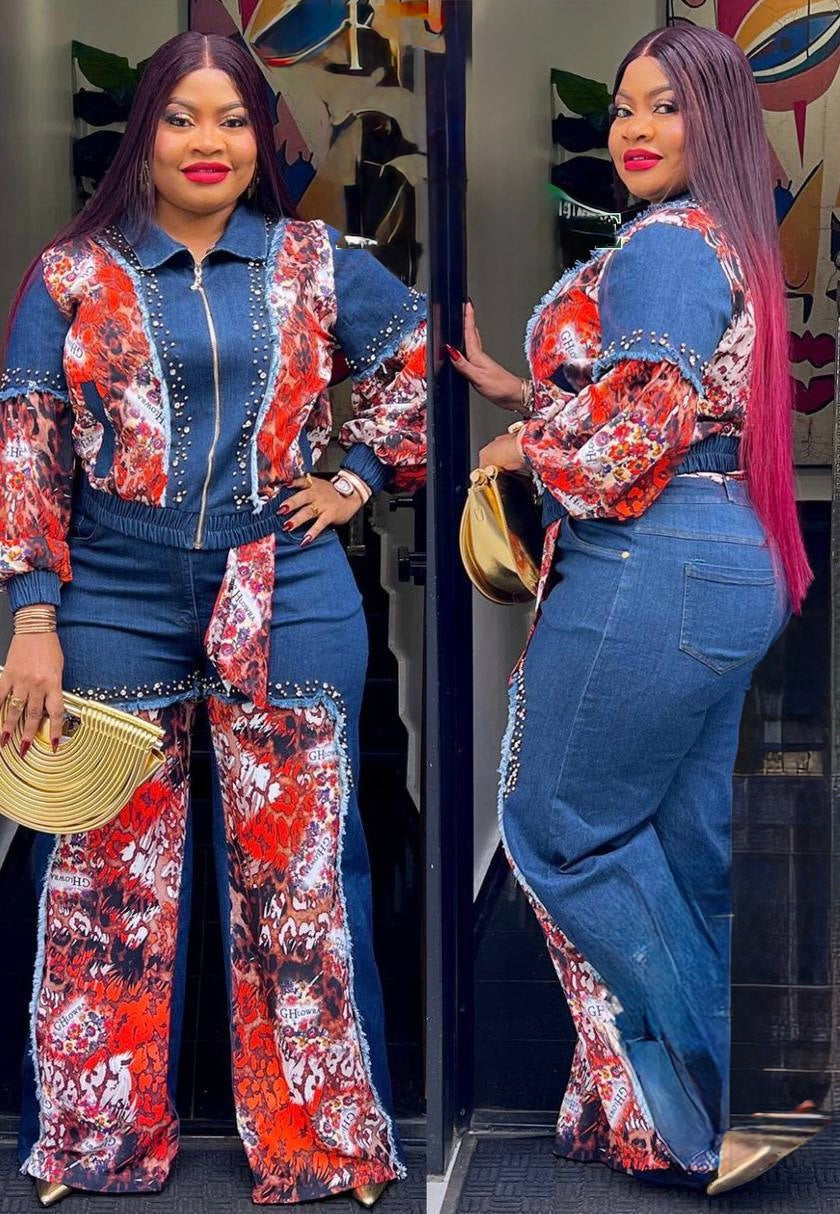 Dramatic Denim & Diamonds 2-Piece Set, Rhinestone Stretch Curvy Cotton Jeans, Birthday Party Dinner Outfit