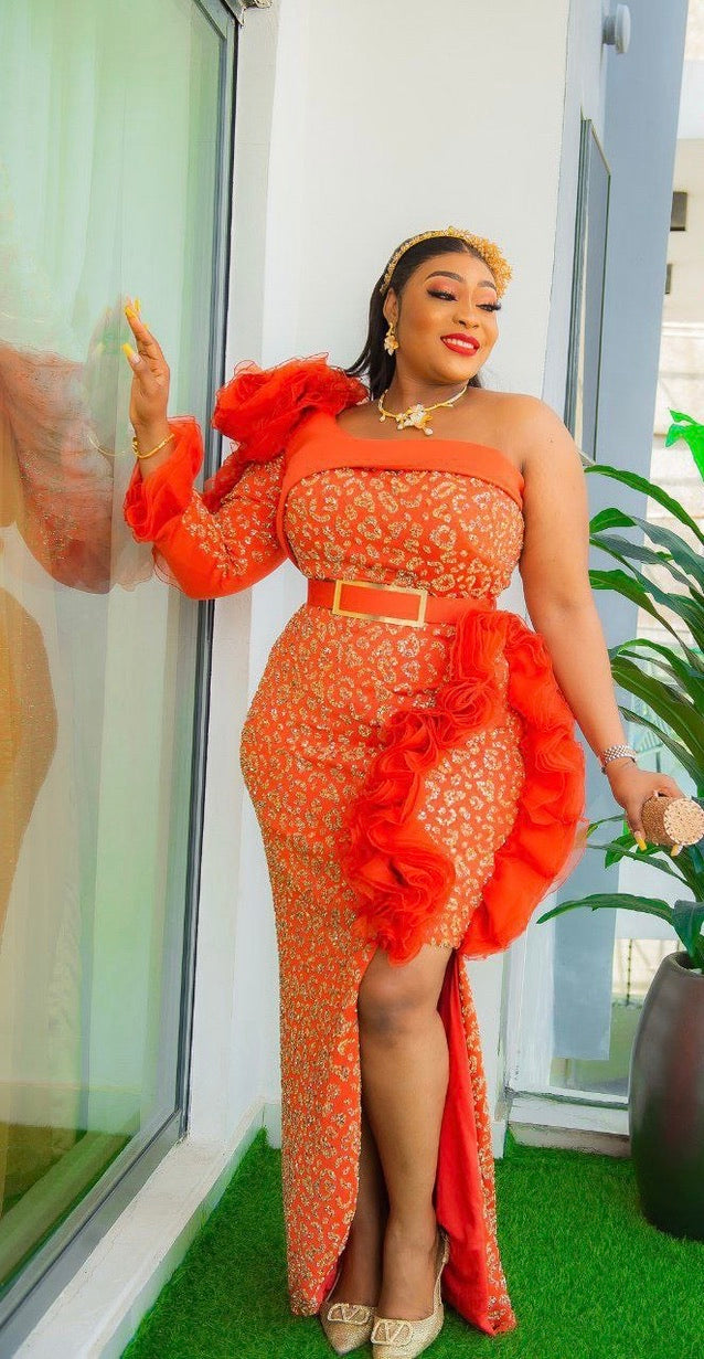Ruffle One-Shoulder Embellished Side-Slit Evening Gown