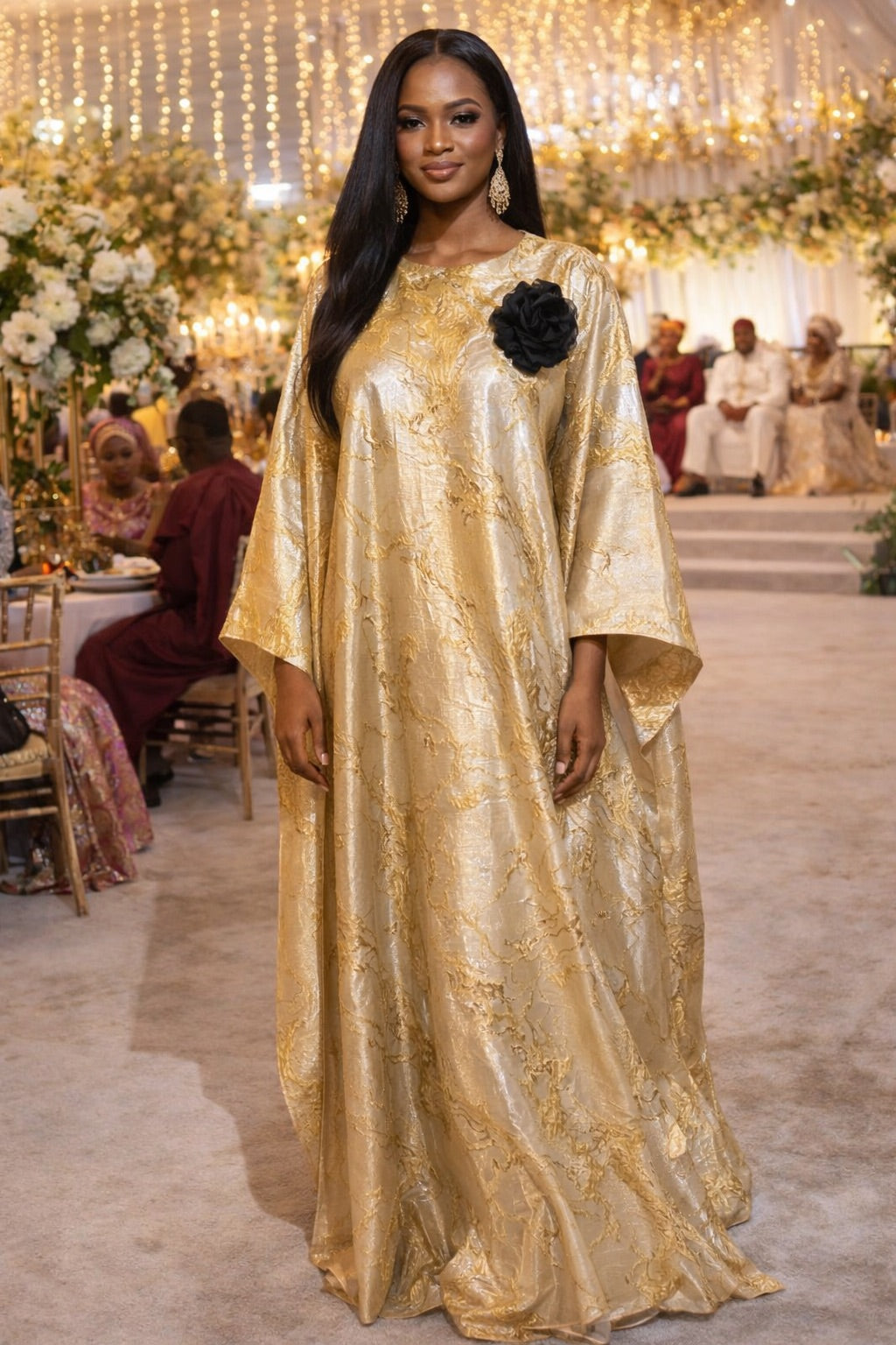 Gold Brocade Kaftan Dress with Detachable Flower, African Bubu Wedding Guest Gown, Mother of The Bride Formal Evening Attire