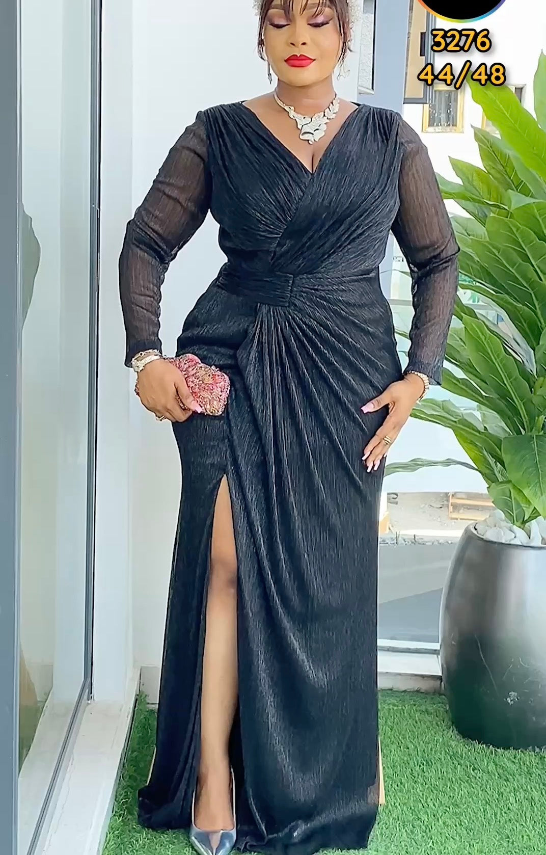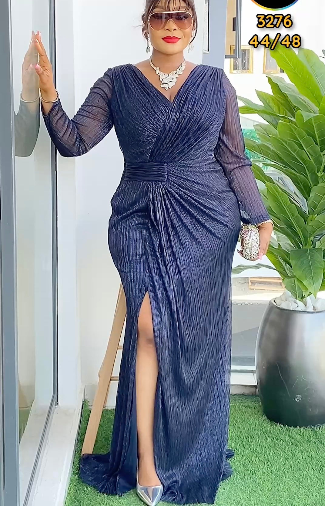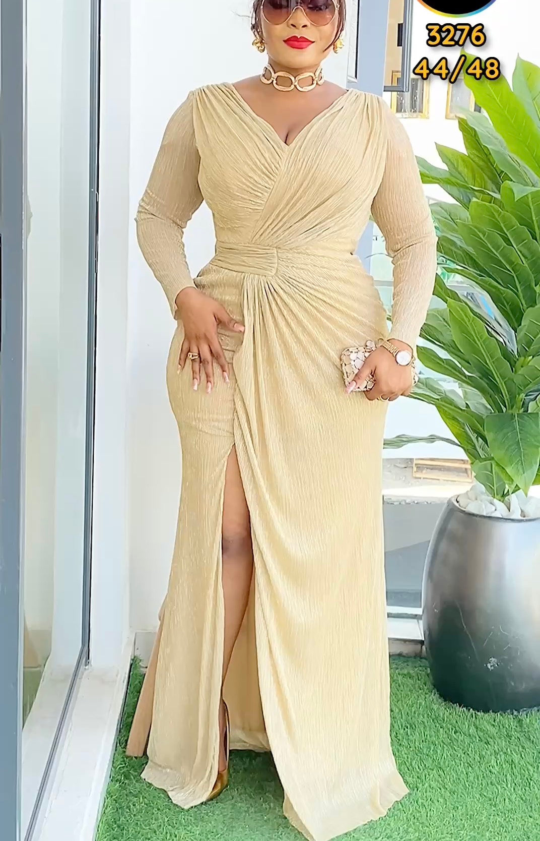 Gold Long Sleeve Sexy Side Slit Evening Gown | Wedding Guest Mother of The Bride Birthday Party