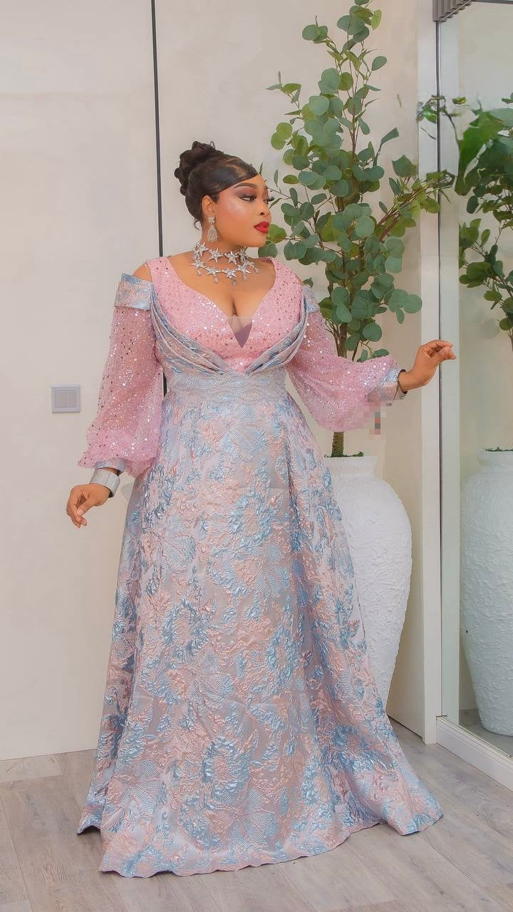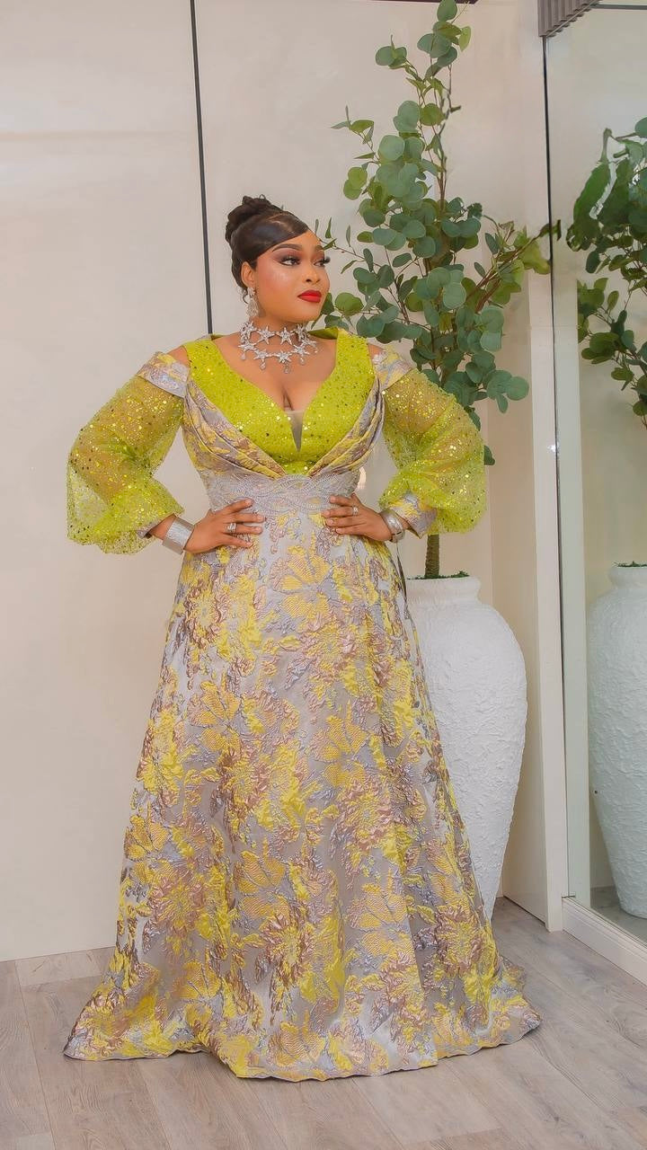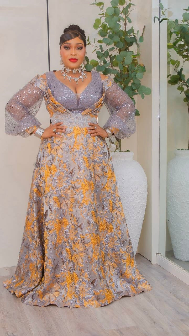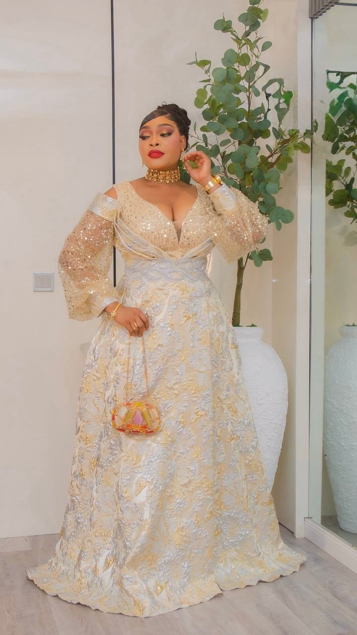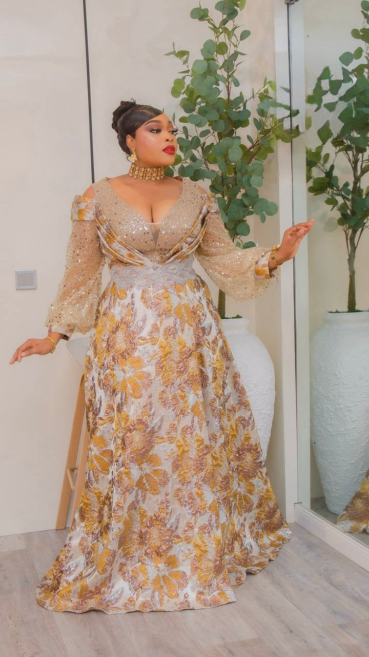 Gold Sequin Brocade A-Line Gown, Cold Shoulder Formal Evening Dress: Wedding Guest Mother of The Bride Gala Birthday
