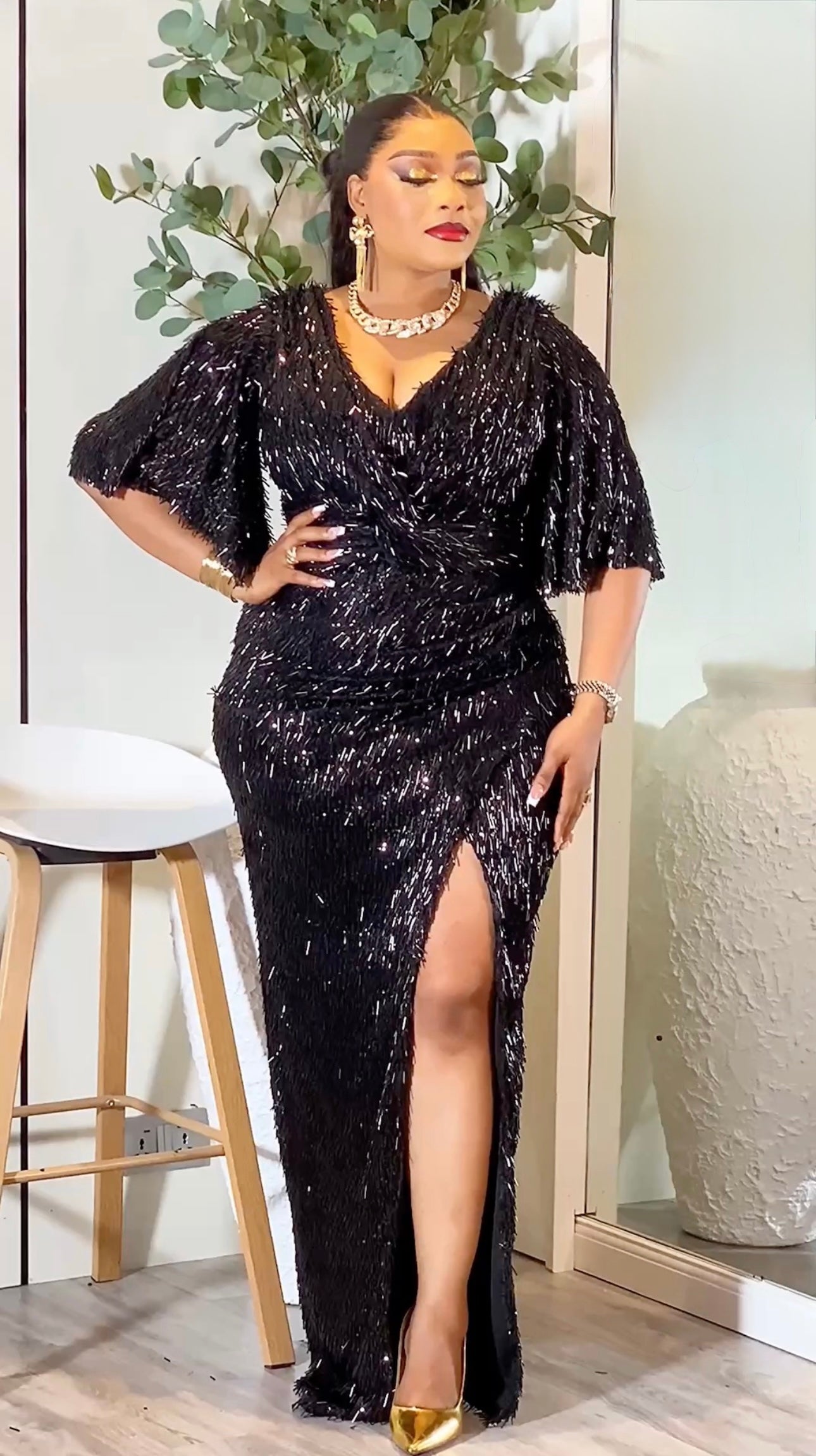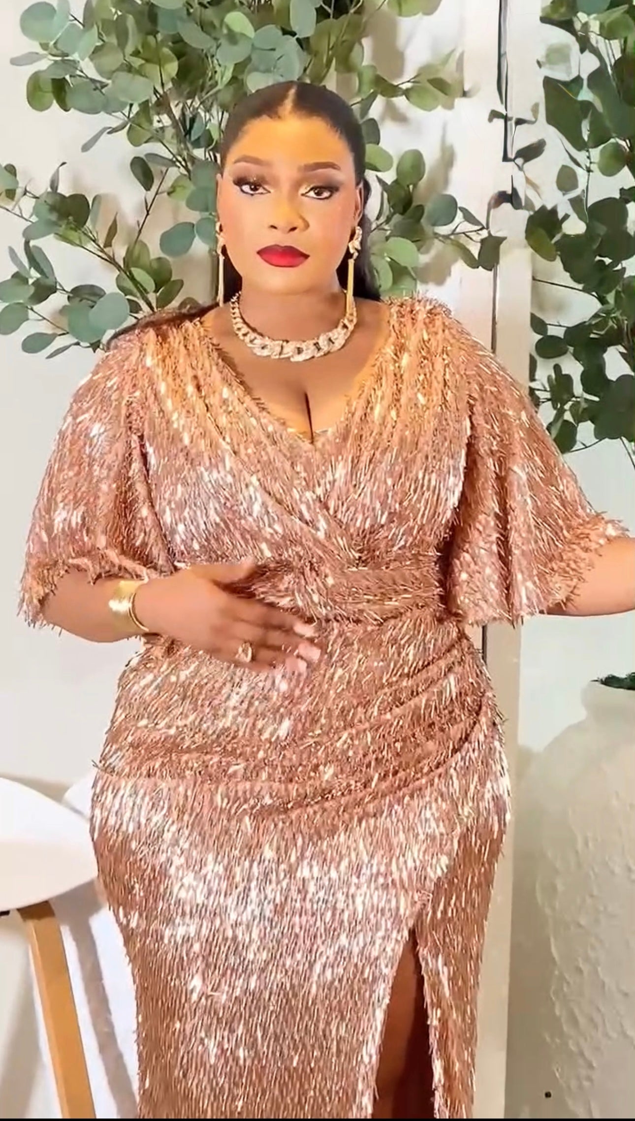 Gold Sequin Fringe Maxi Dress with Slit for Wedding Guest Birthday Party Mother of The Bride Photoshoot