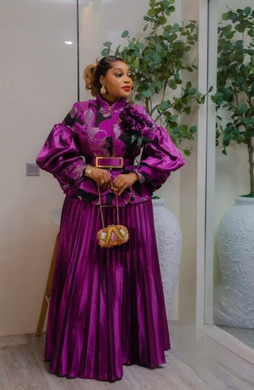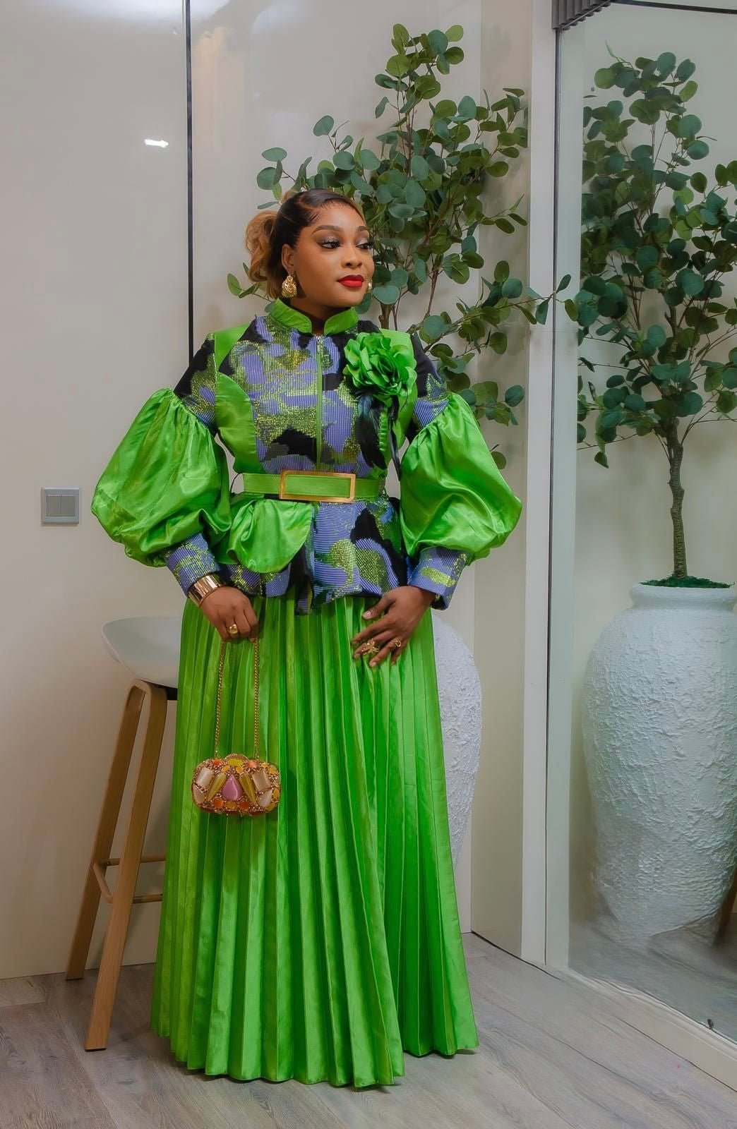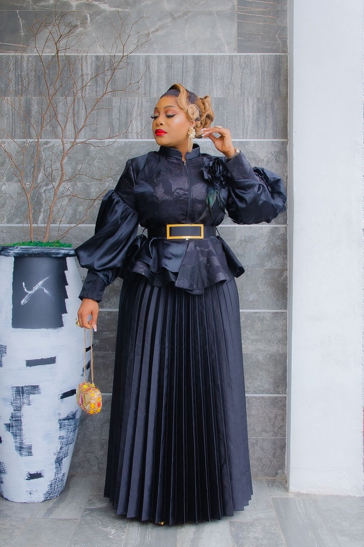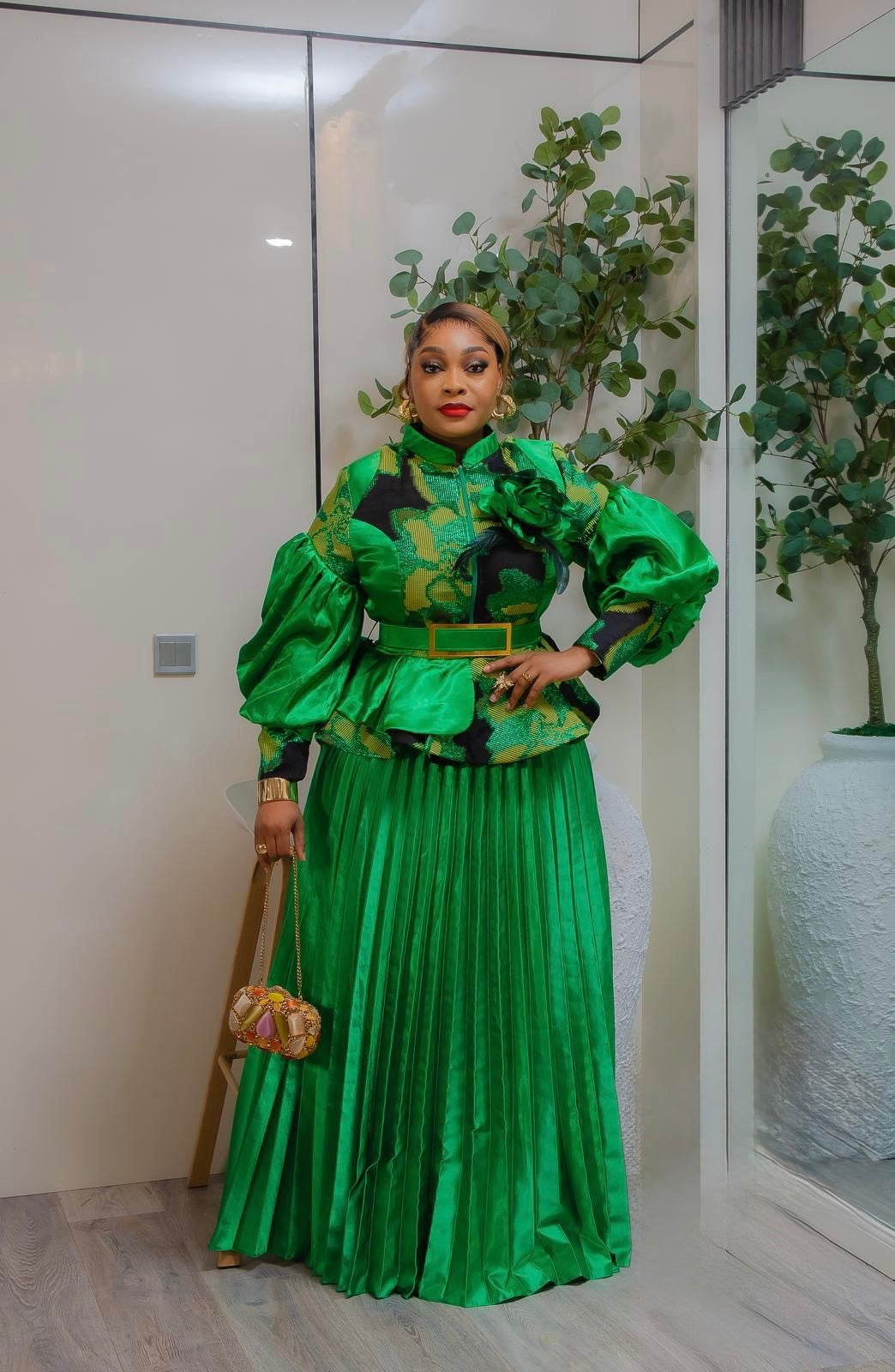 Green Brocade 3D Flower Peplum Top & Pleated A-Line Skirt 2-Piece Outfit Set for Mother of The Bride Wedding Guest Gala Birthday Photoshoot