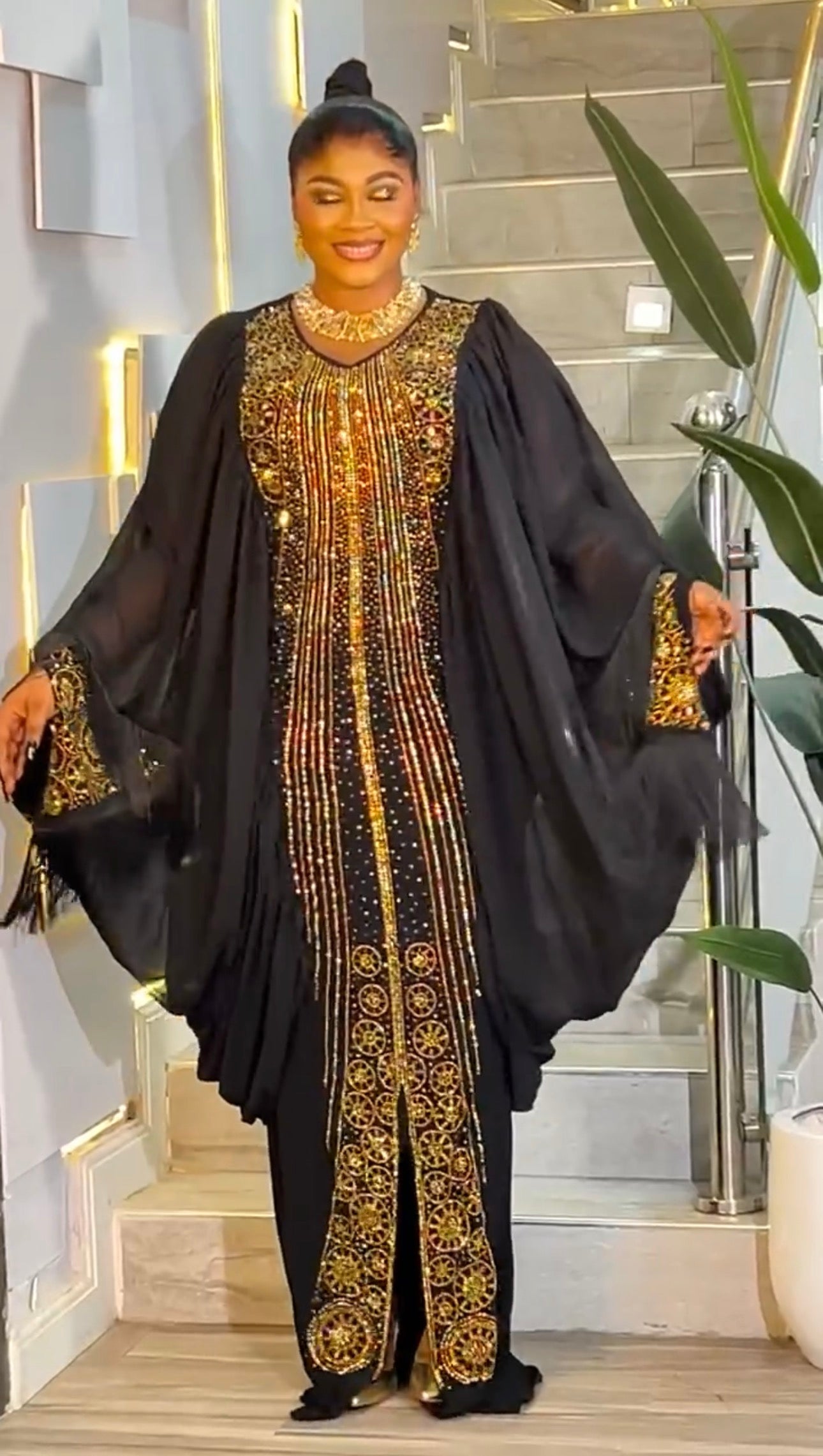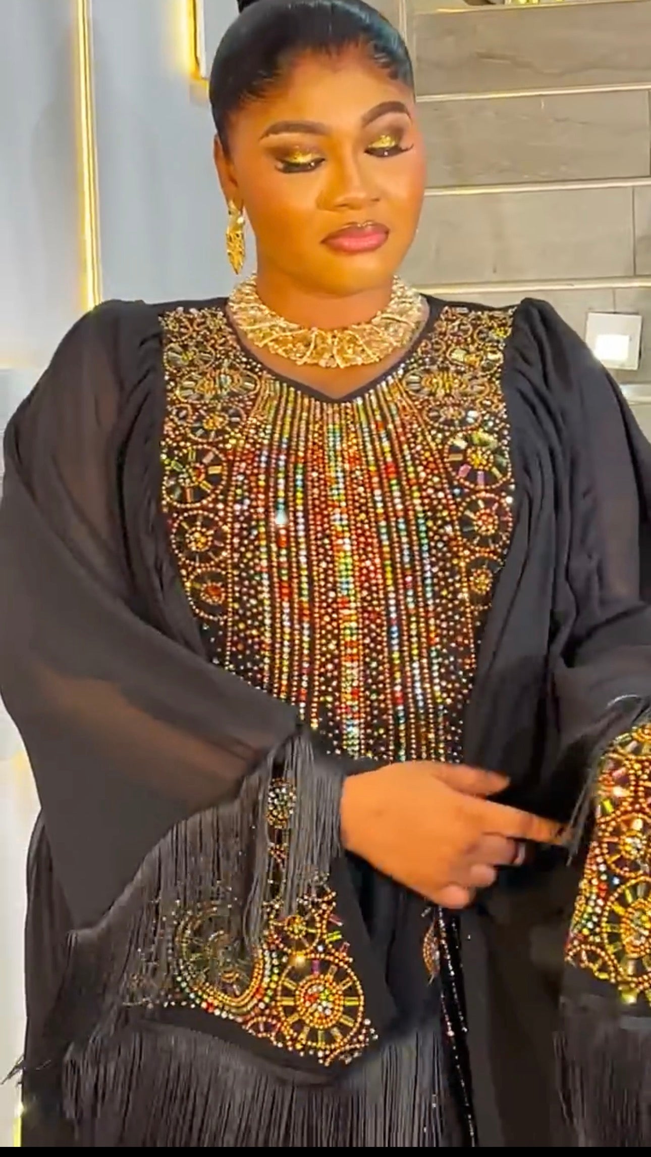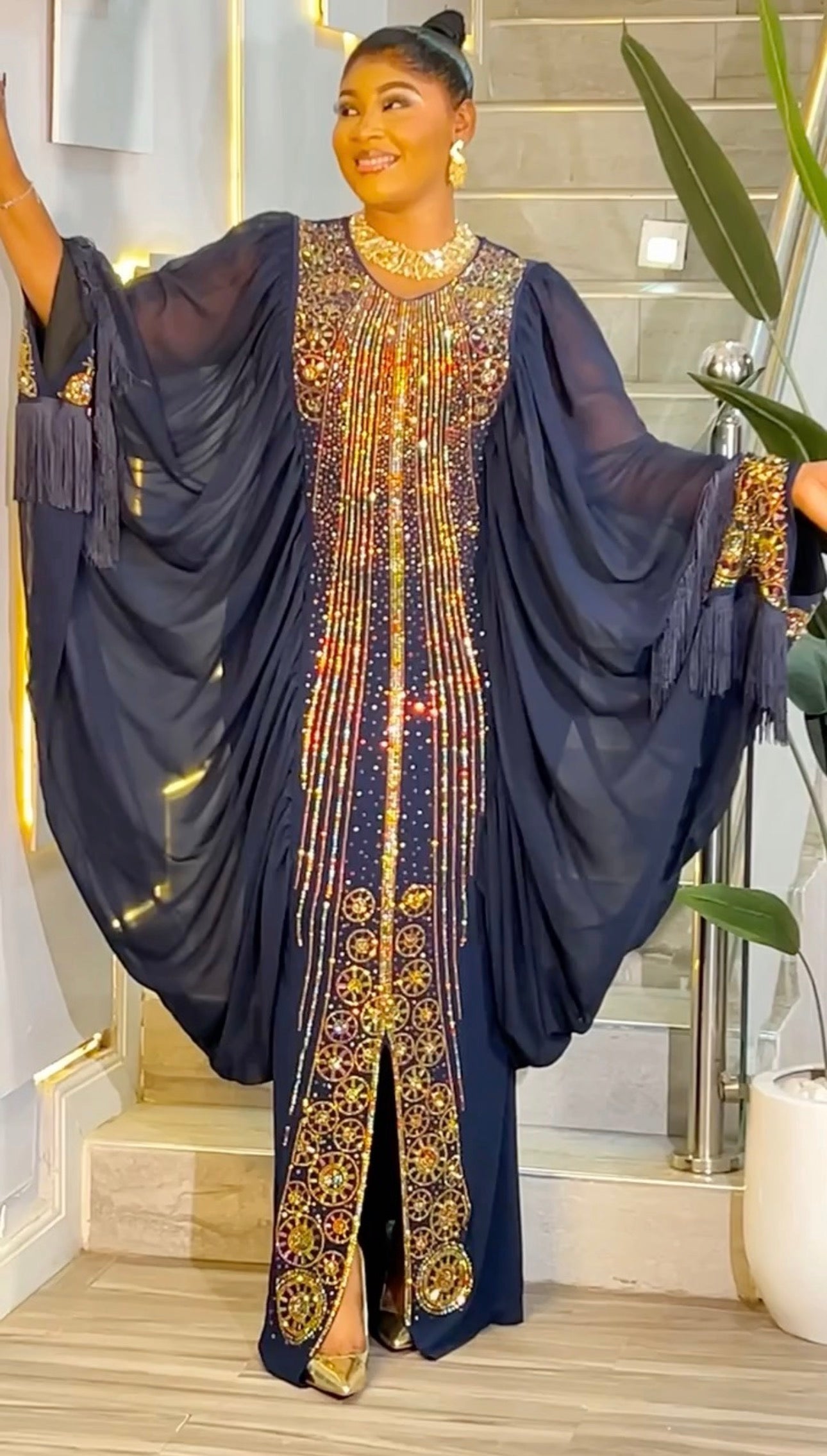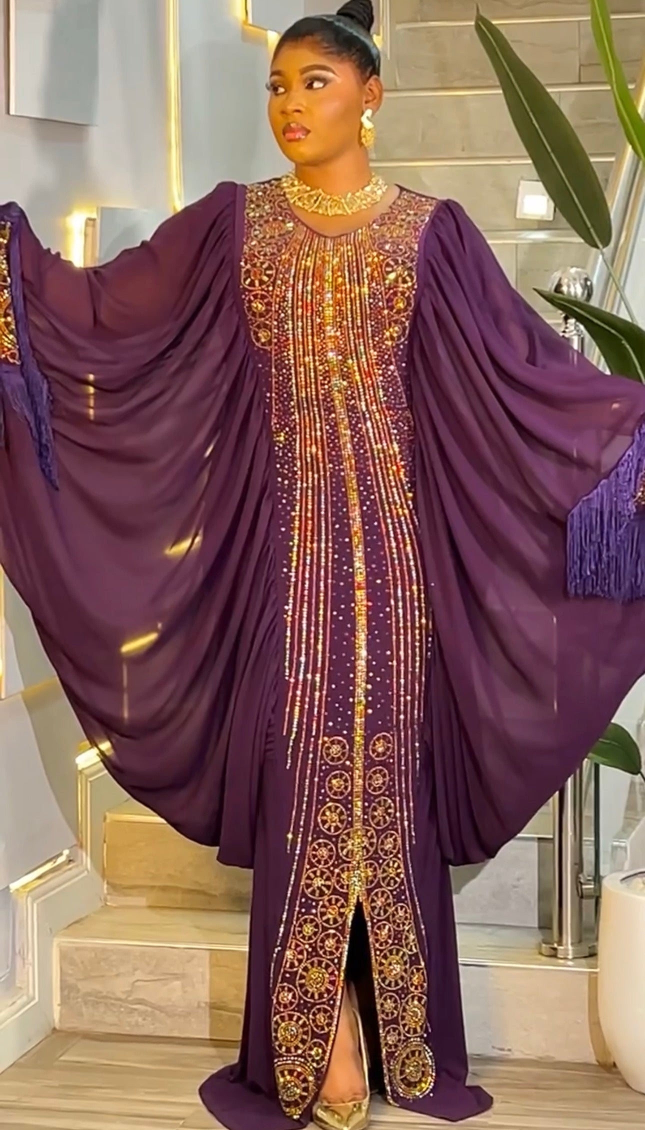 Kaftan Tasseled Dress with Rhinestones, African Bubu Wedding Guest Attire Abaya Mother of The Bride Outfit