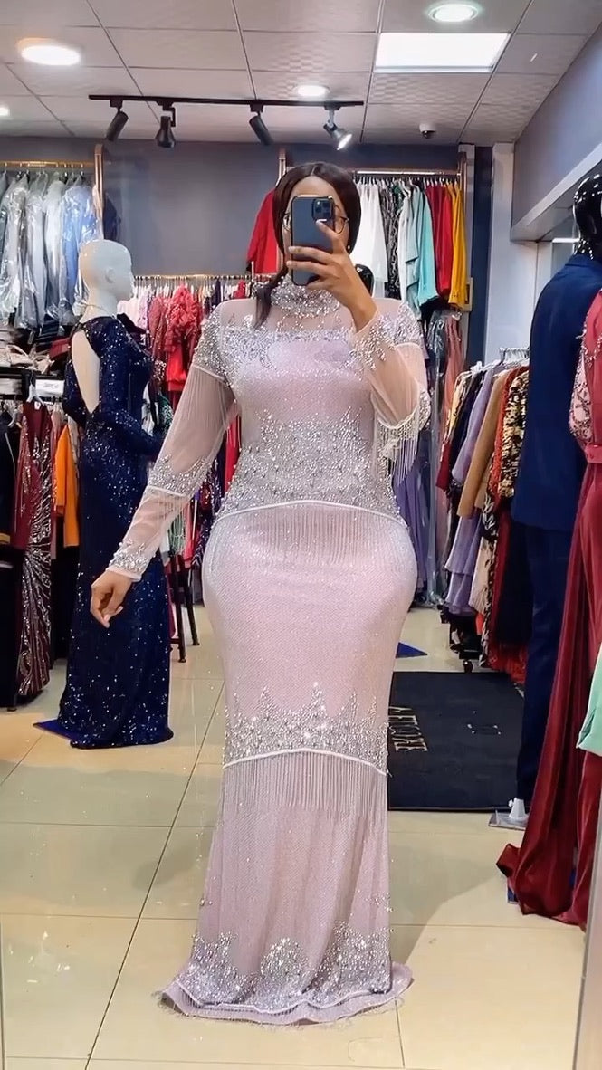 Metallic Fringe Beaded Trumpet Gown Pink Lavender