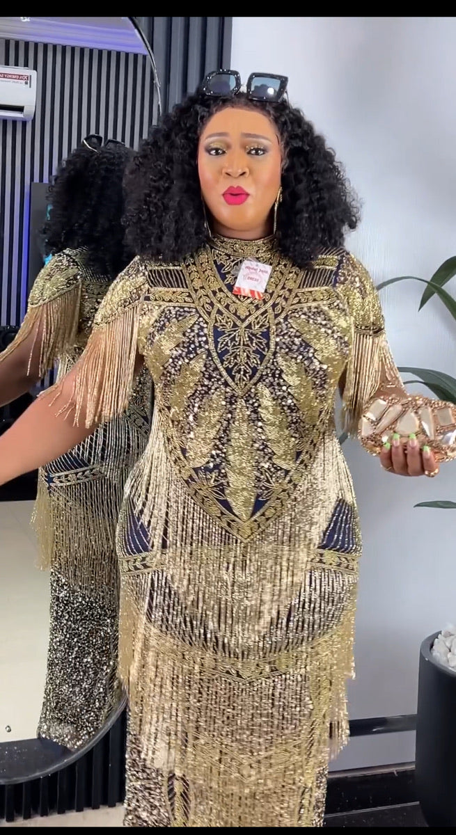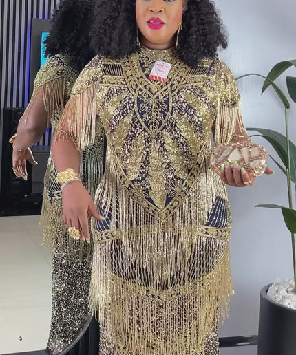 Dripping in details, shake the night away in this sparkling beaded maxi fringe dress. Prepare to captivate with every step as the fringe hem sways and moves, creating a playful and fun atmosphere wherever you go. This metallic gold party dress features a fitted silhouette with layers and layers of bold hand-beaded fringe and swirls of elegant sequins, adding a touch of glamour that will leave onlookers in awe.