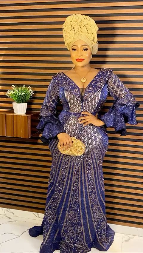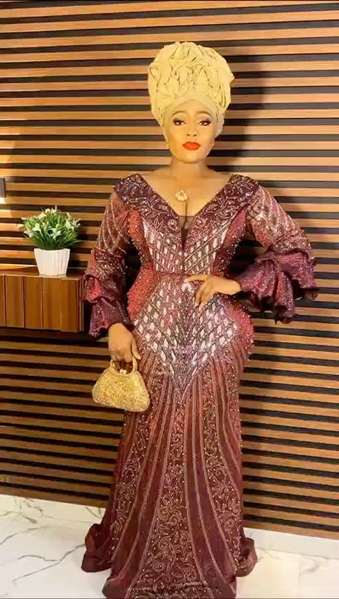 Ruffle Sleeve V Neck Embellished Mermaid Gown