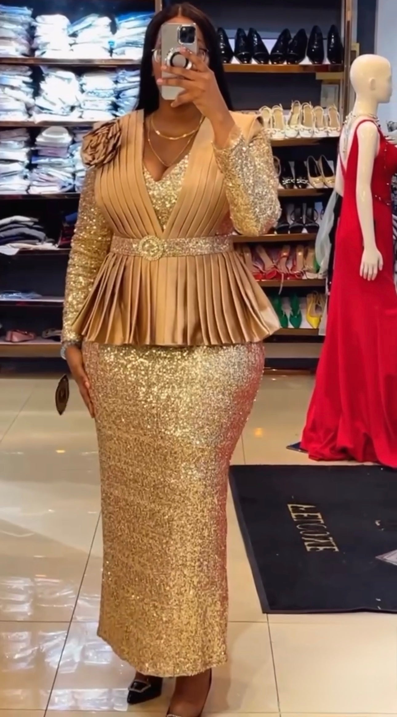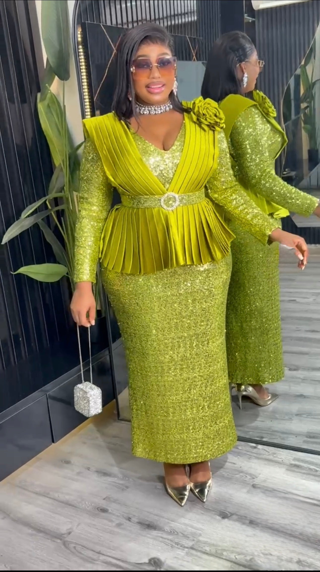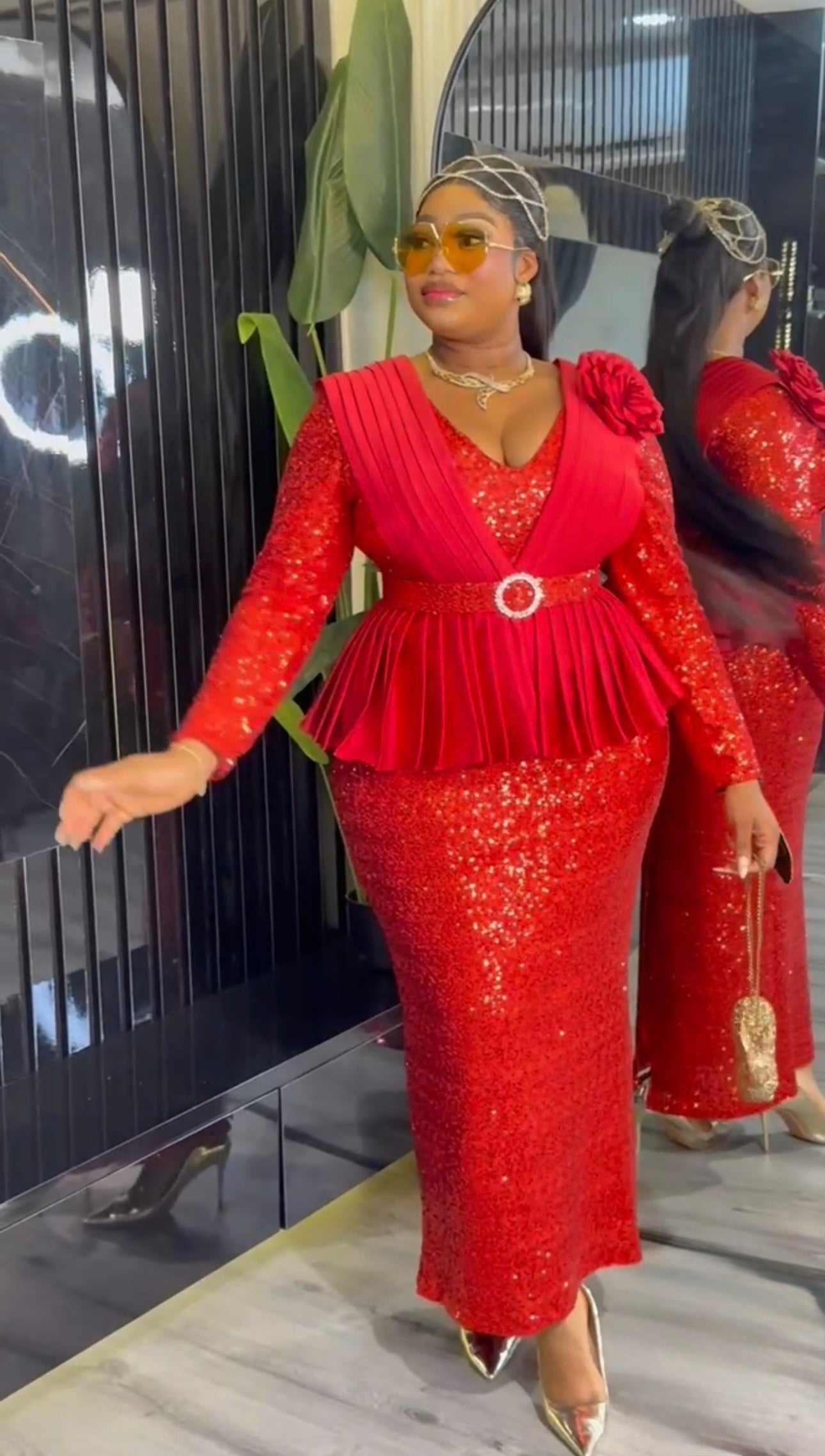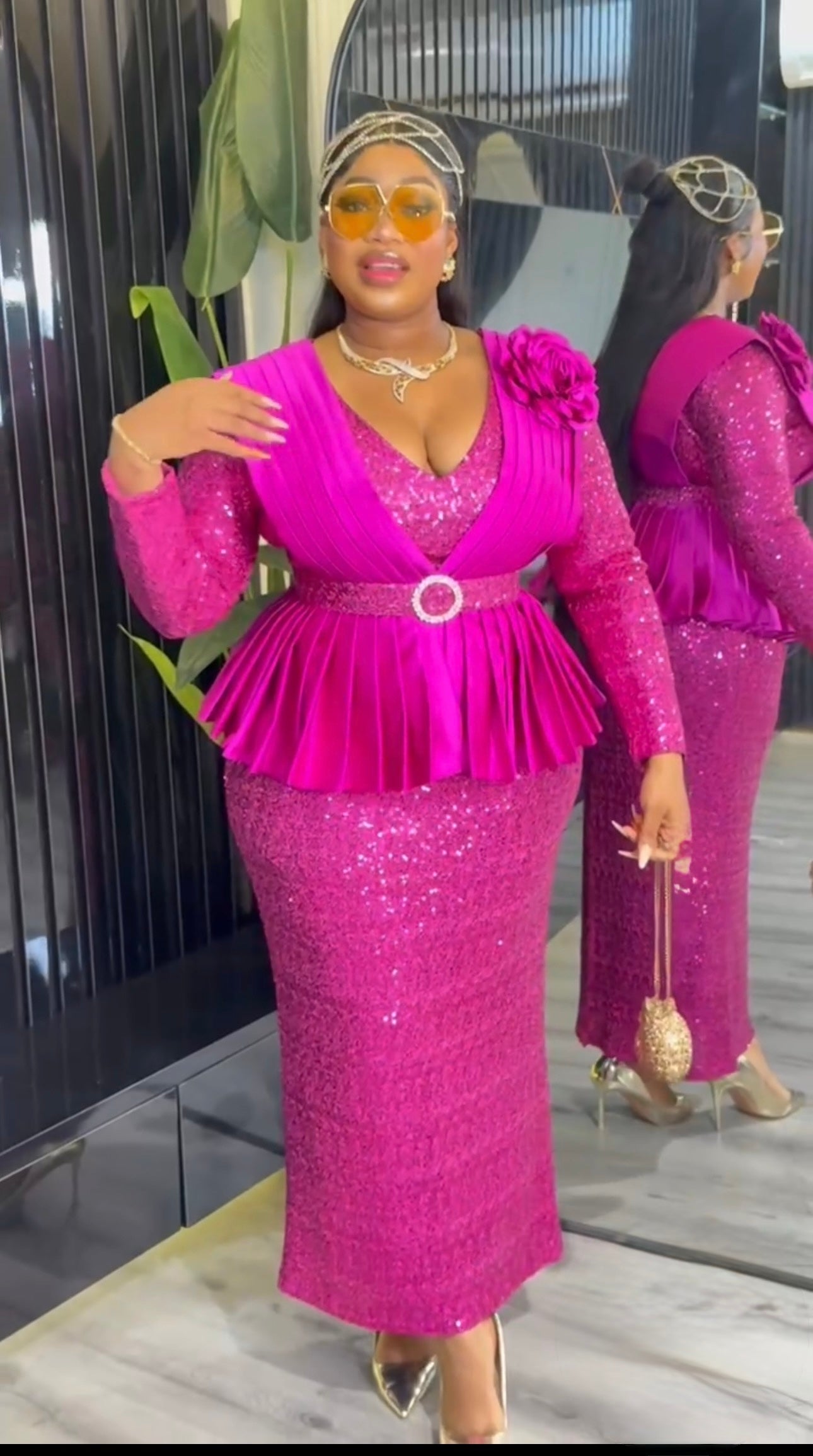 Pink Sequin Embellished Peplum Maxi Dress with 3D Flower