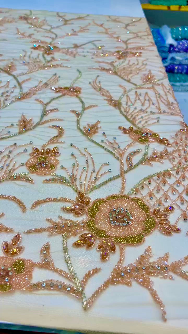 Shimmer, sparkle, and shine in this Swarovski Crystal Hand-Beaded Fabric - the perfect choice for any extra-special occasion. This statement-making fabric is perfect for dressmaking: bridal evening gown, mother of the bride/groom, prom, graduation, gala, birthday, pageants, or celebrant reception dress. The sparkle of the beadwork catching the light as you move, the way the fabric drapes effortlessly over your curves, and the feeling of pure confidence that comes with wearing such a stunning piece, creates a dazzling display that elevates your presence.