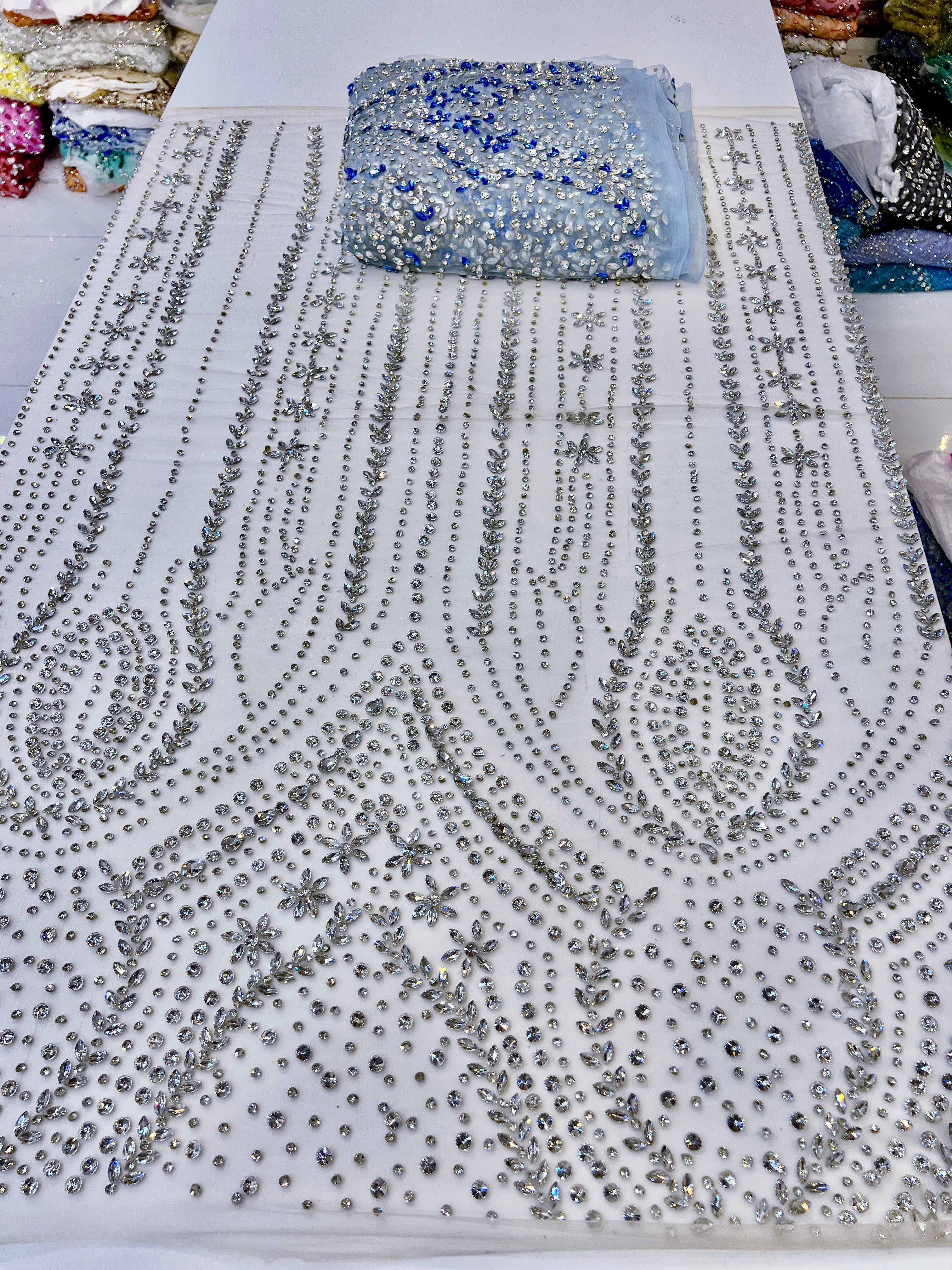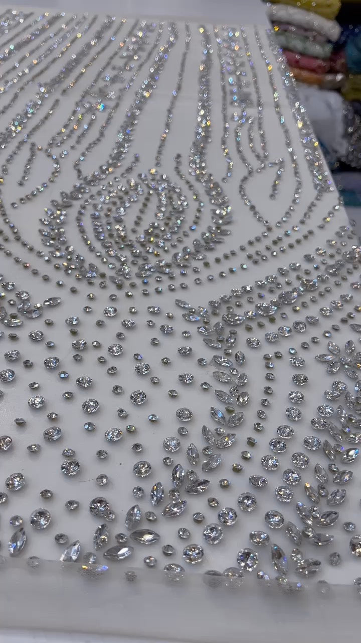 Shimmer, sparkle, and shine in this Swarovski Crystal Embellished Fabric - the perfect choice for any extra-special occasion. This statement-making fabric is perfect for dressmaking: bridal evening gown, mother of the bride/groom, prom, graduation, gala, birthday, pageants, or celebrant reception dress. The sparkle of the beadwork catching the light as you move, the way the fabric drapes effortlessly over your curves, and the feeling of pure confidence that comes with wearing such a stunning piece, creates a dazzling display that elevates your presence.