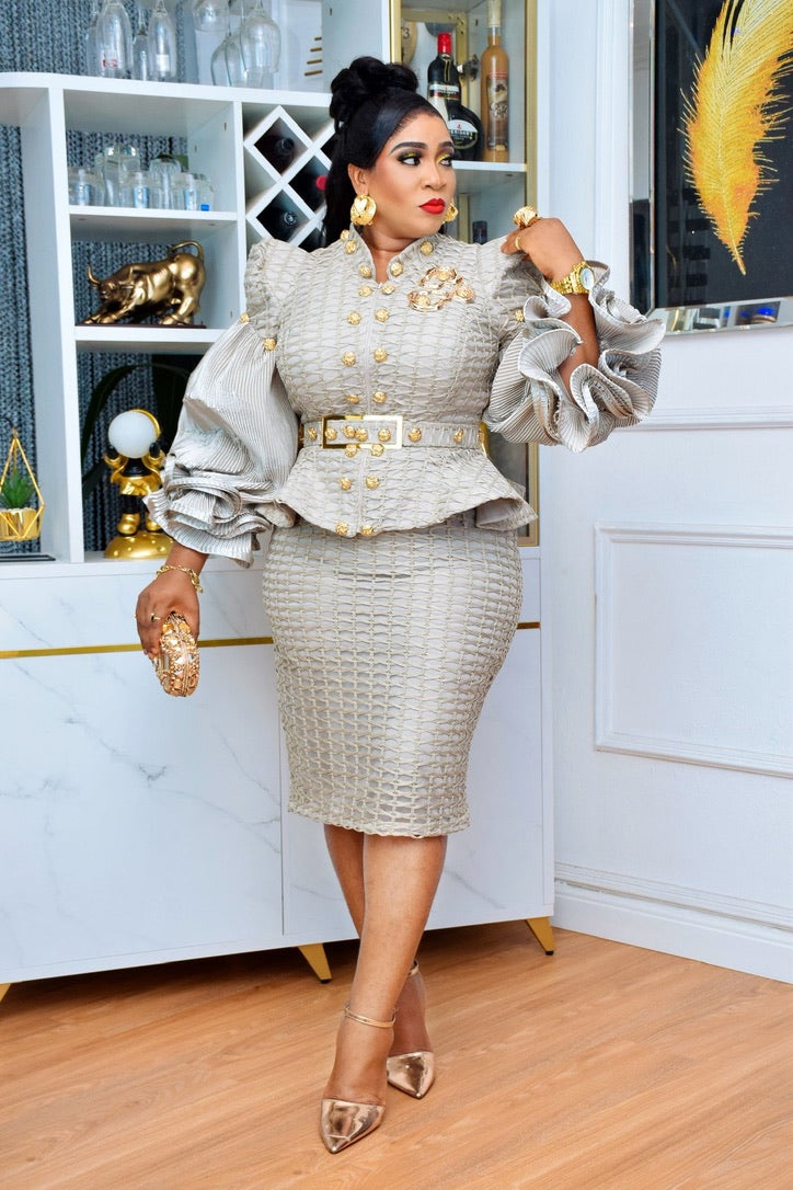 Dramatic White Ruffle Sleeve Peplum Top & Skirt 2-Piece Outfit for Mother of The Bride or Groom Wedding Guest Birthday Party Cocktail