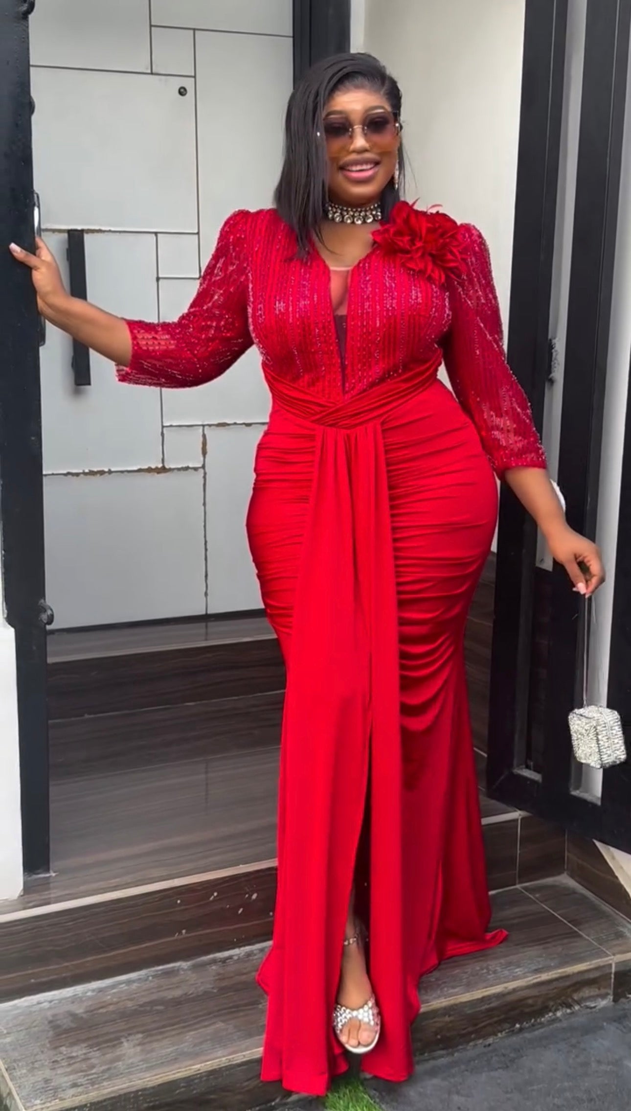 White Embellished 3D Flower Ruched Draped Maxi Dress for Engagement Ceremony Wedding Guest Anniversary Dinner Cocktail Photoshoot