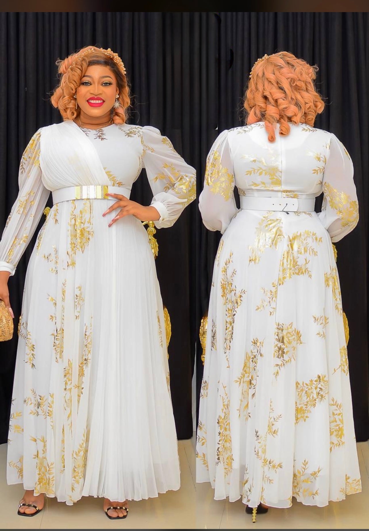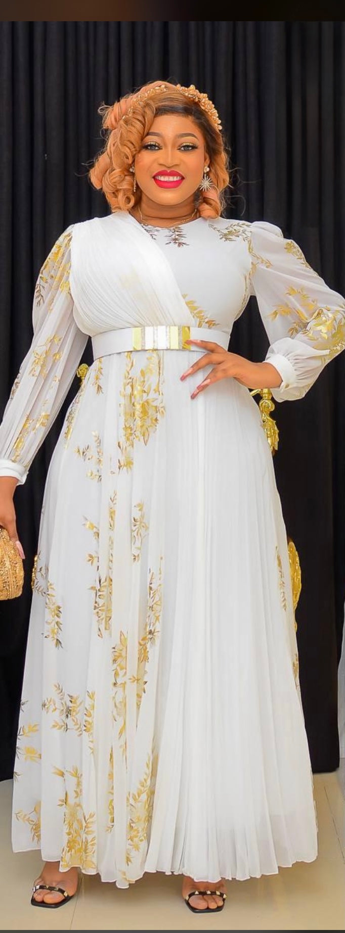 White & Gold Long Sleeve Pleated Flare Maxi Dress for Wedding Guest Birthday Party Cocktail