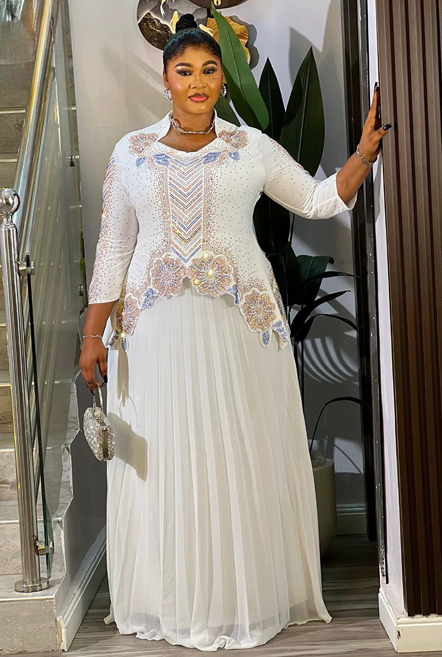 White Rhinestone Embellished Pleated Maxi Dress: Wedding Guest Birthday Party Mother of The Bride Dinner