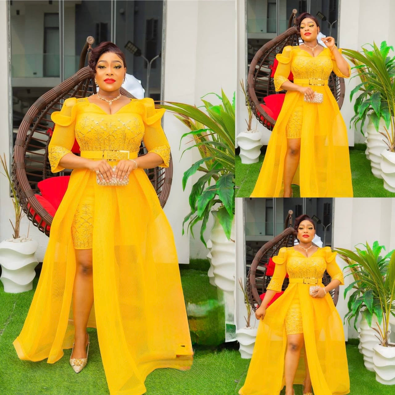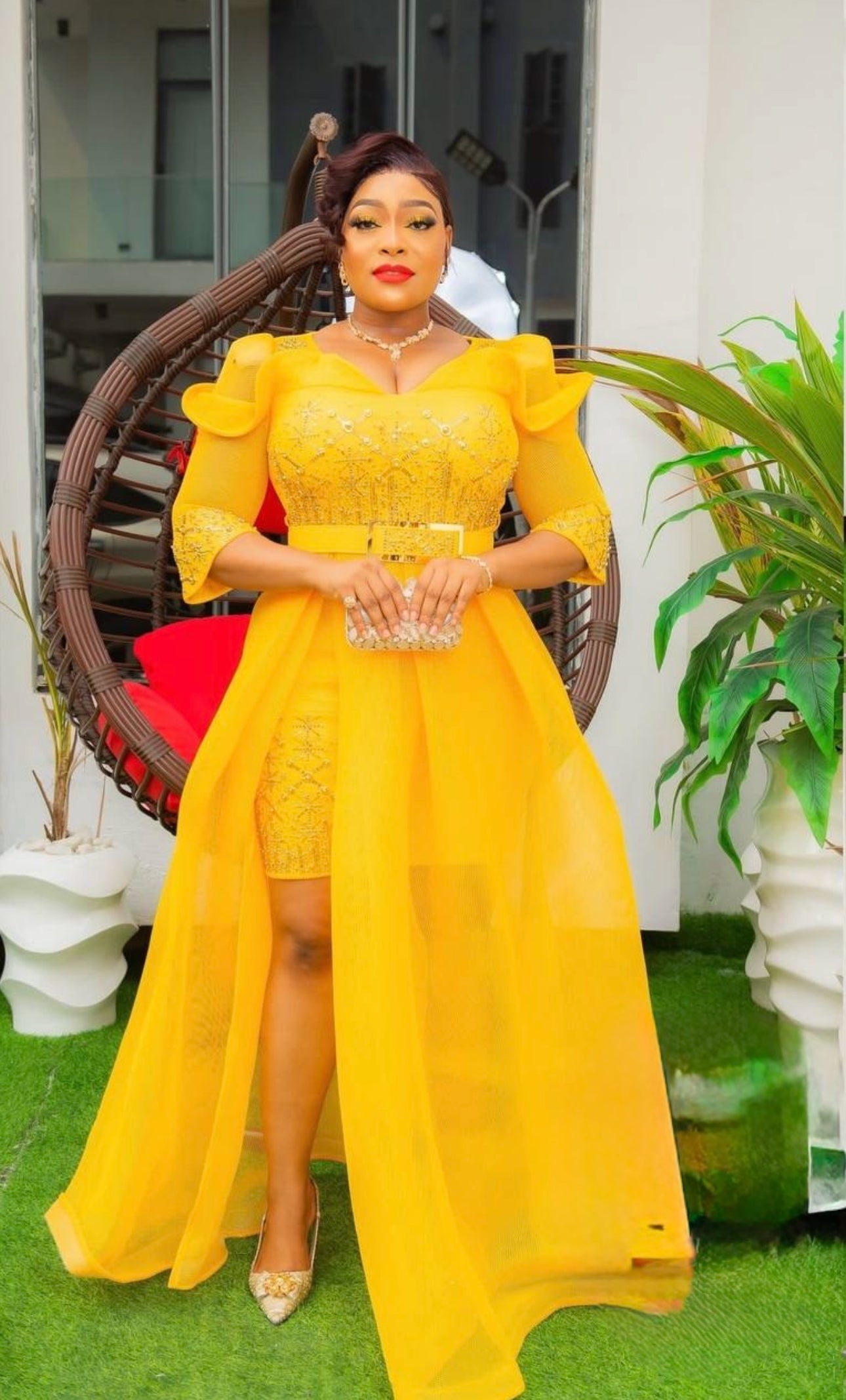 Yellow Embellished Draped Ruffle Sleeve Gown